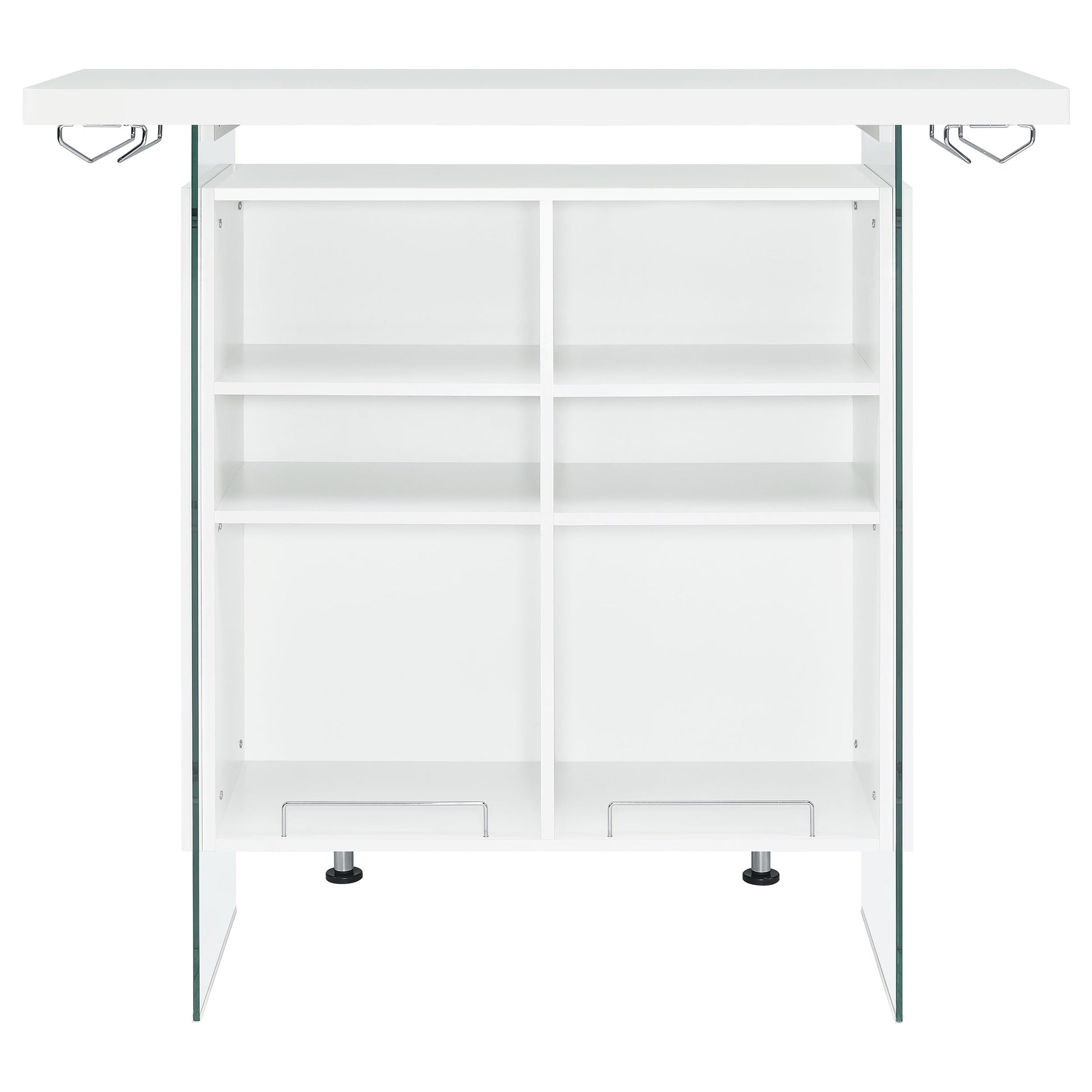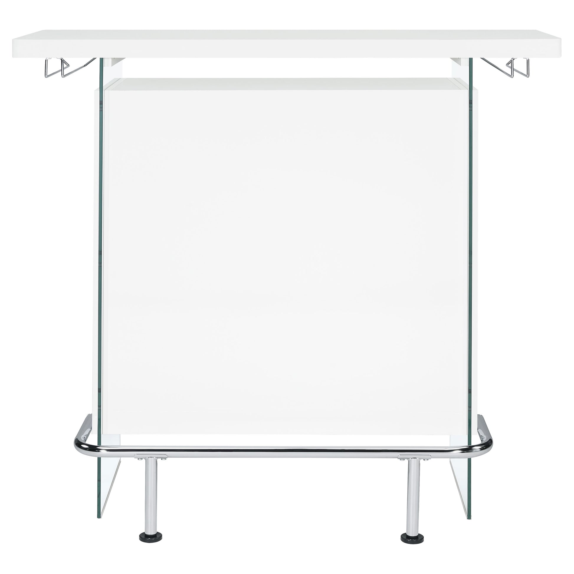 Elevate a multipurpose living room with this modern bar unit. A neutral finish, accented with polished chrome metal accents offers a striking design contrast. Supported and flanked by clear tempered glass side panels, this bar unit boasts ultra-modern elements as well for a dramatic feel. Compact yet highly functional, this bar unit also features ample storage space with six built-in open shelves for storing bottles, serving pieces and other mixologist must-haves. Tucked beneath the bar top along each side is a stemware rack for wine glasses and more.
