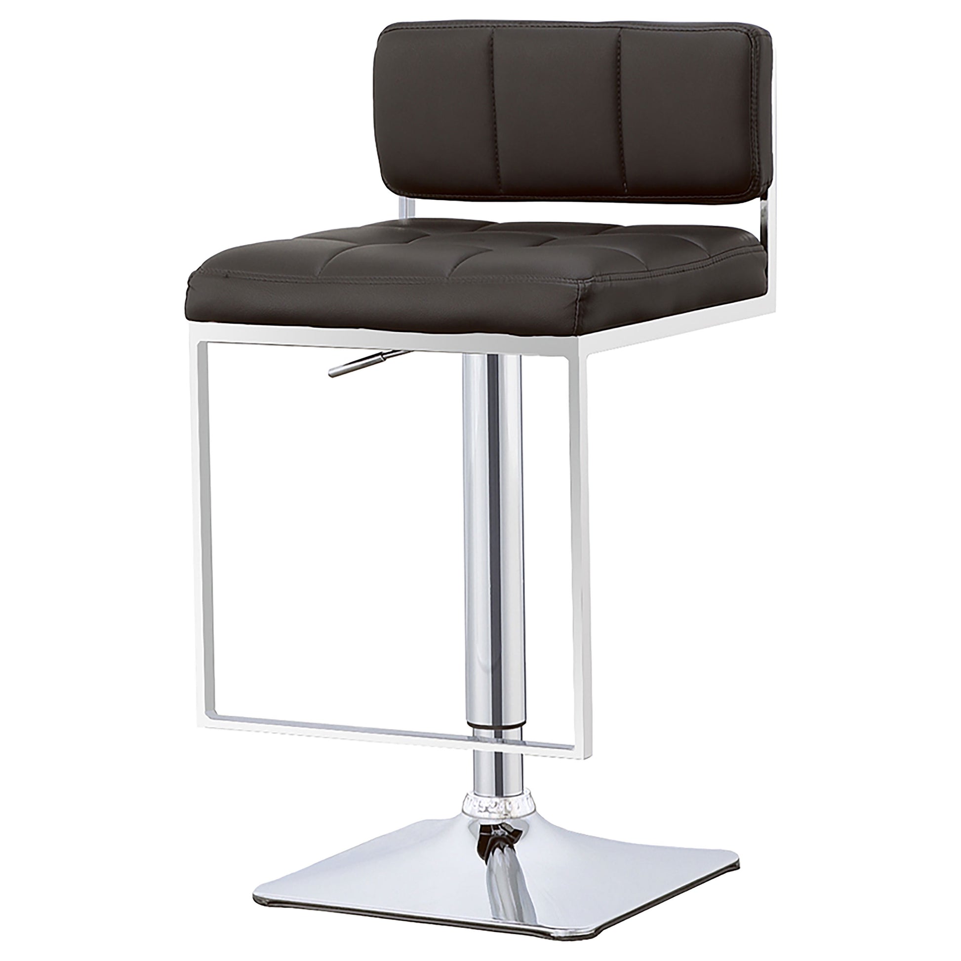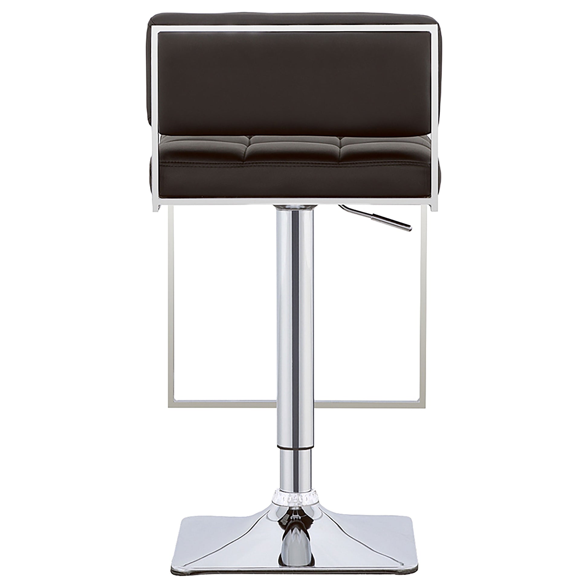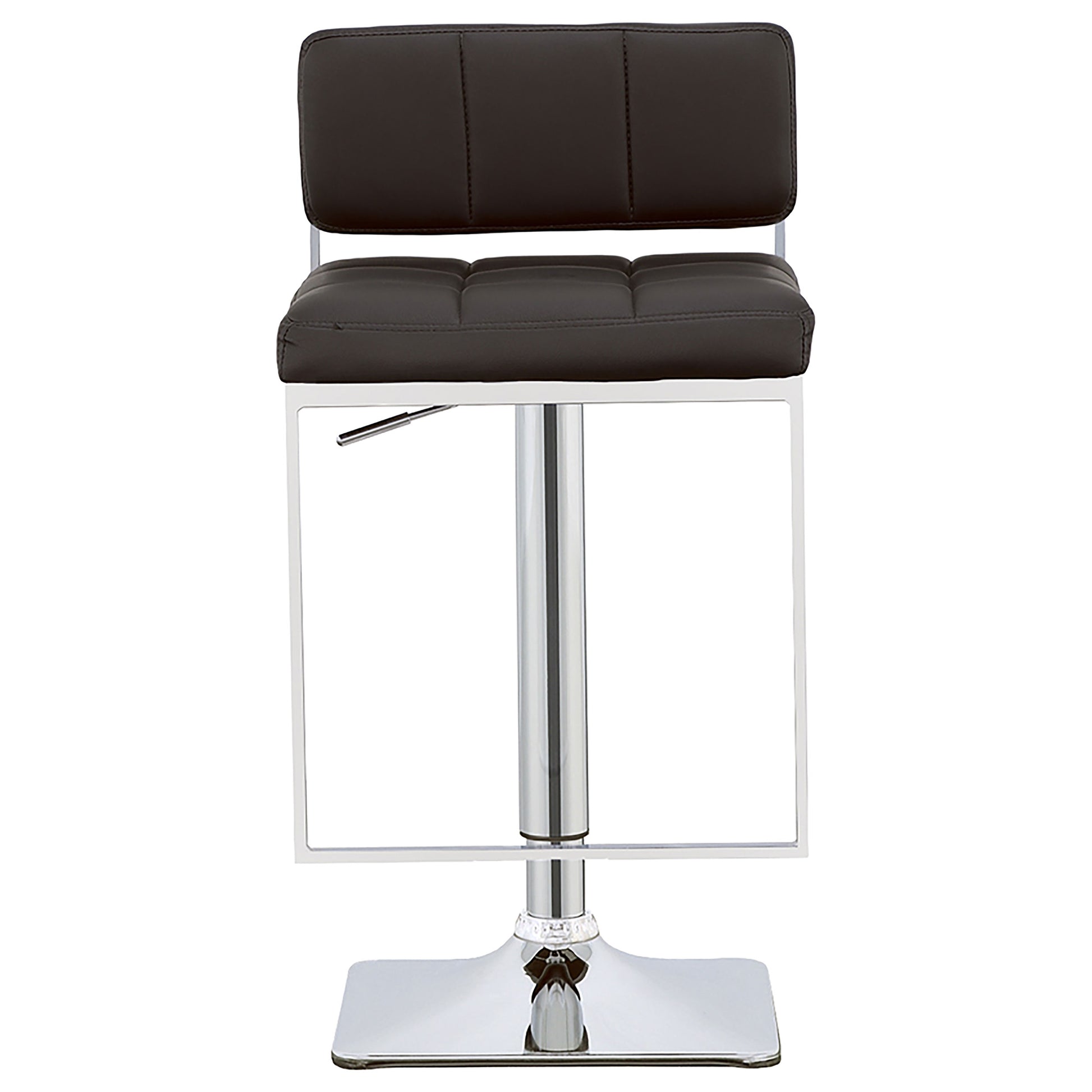 Sleek and compact, this handsome bar stool enhances even the smallest of spaces with an edge of contemporary flair. Its understated elegance easily matches with most any style of decor. The crisp, clean lines of its modern silhouette combine pleasingly with the classic tufting of its plush, leather-like seats. A shiny, silvery chrome finish adds an appealing touch of polish. This versatile stool is easily adjustable to accommodate the height of any table or counter, upgrading any living space with comfort and convenience.