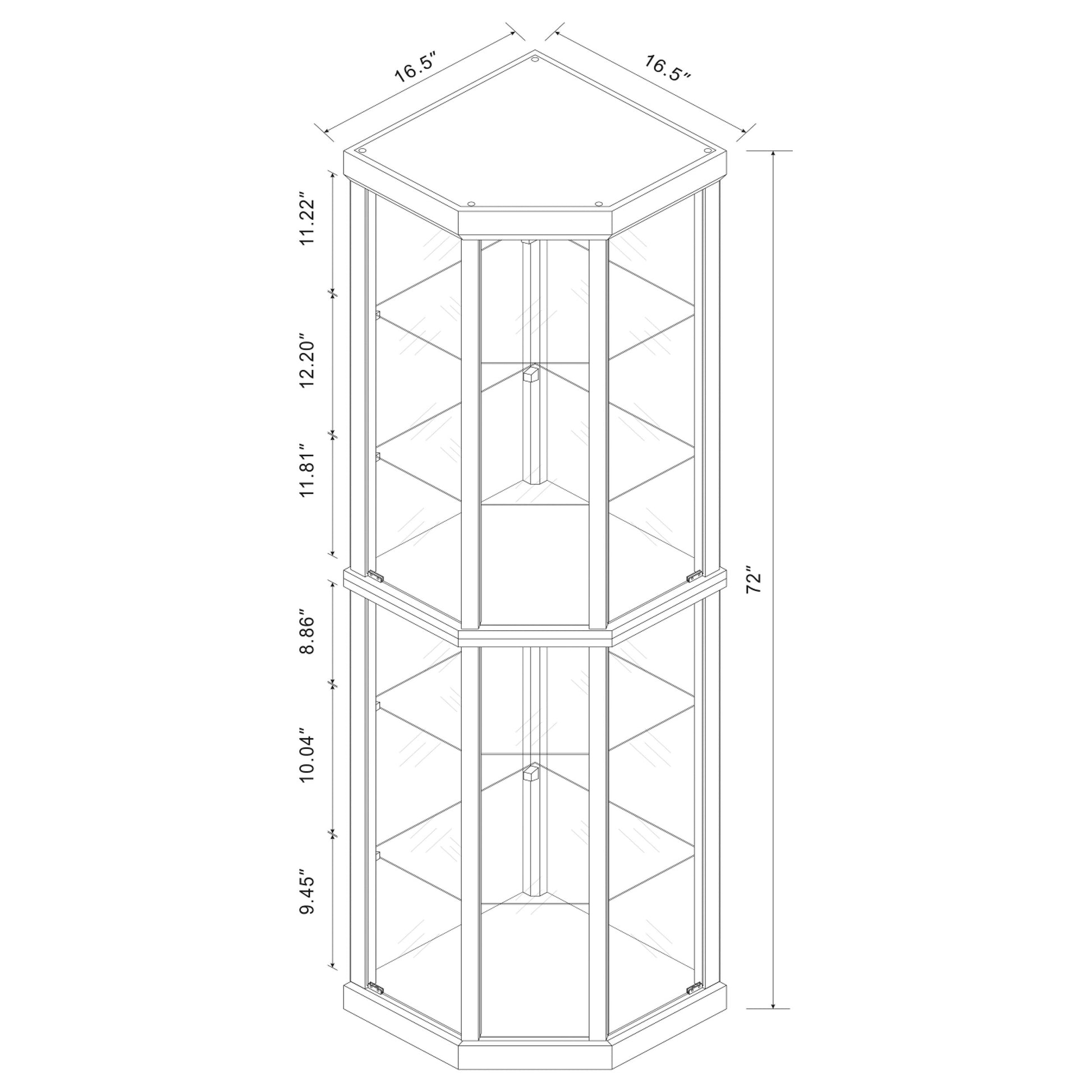If you fancy special collectibles or unique knickknacks, where can you show them all off? This corner curio cabinet is a fantastic place, for starters. It is crafted to fit perfectly into the corner of your living room or den for prominence. Features five glass shelves plus a bottom one for plenty of display areas. Beautifully finished in medium brown that matches almost any decor.