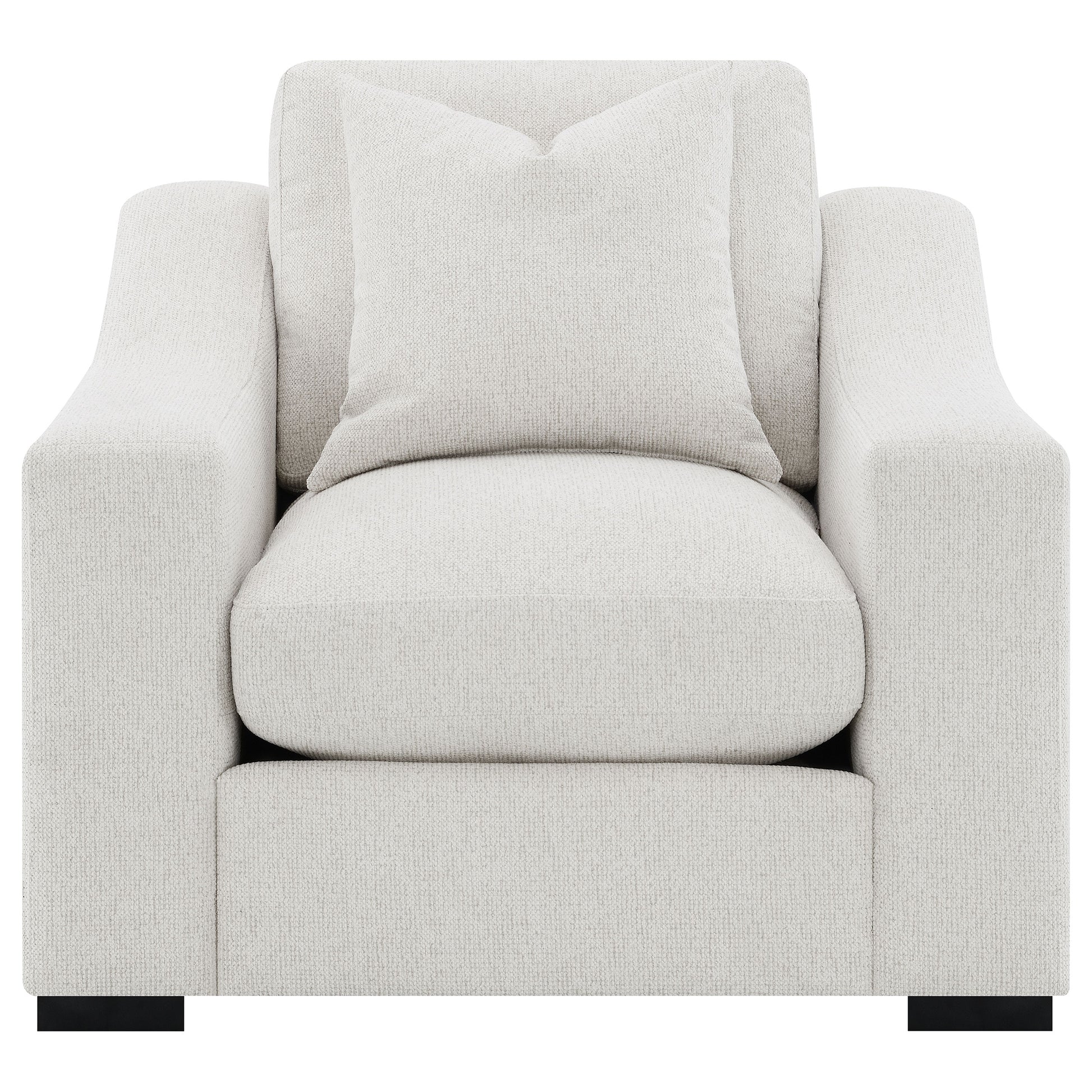 • Accent chair with track arms and plush silhouette wrapped in sand textured upholstery