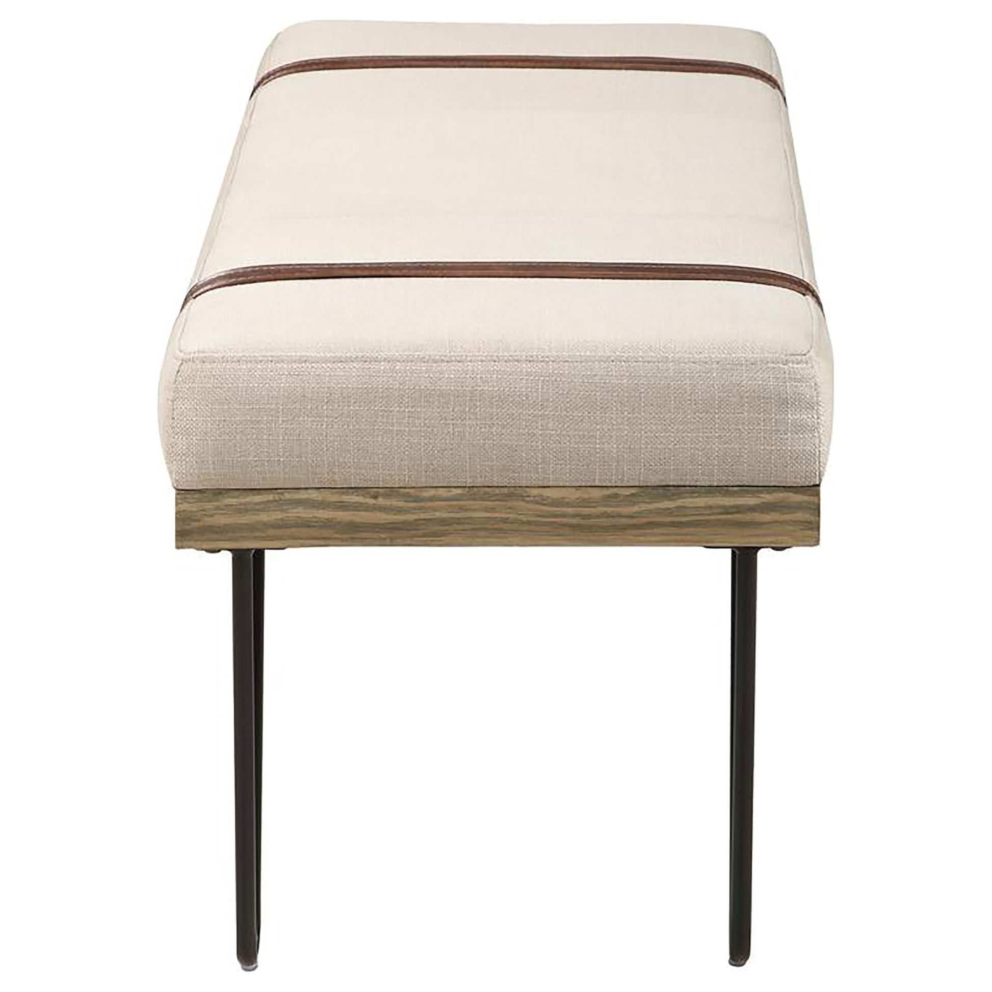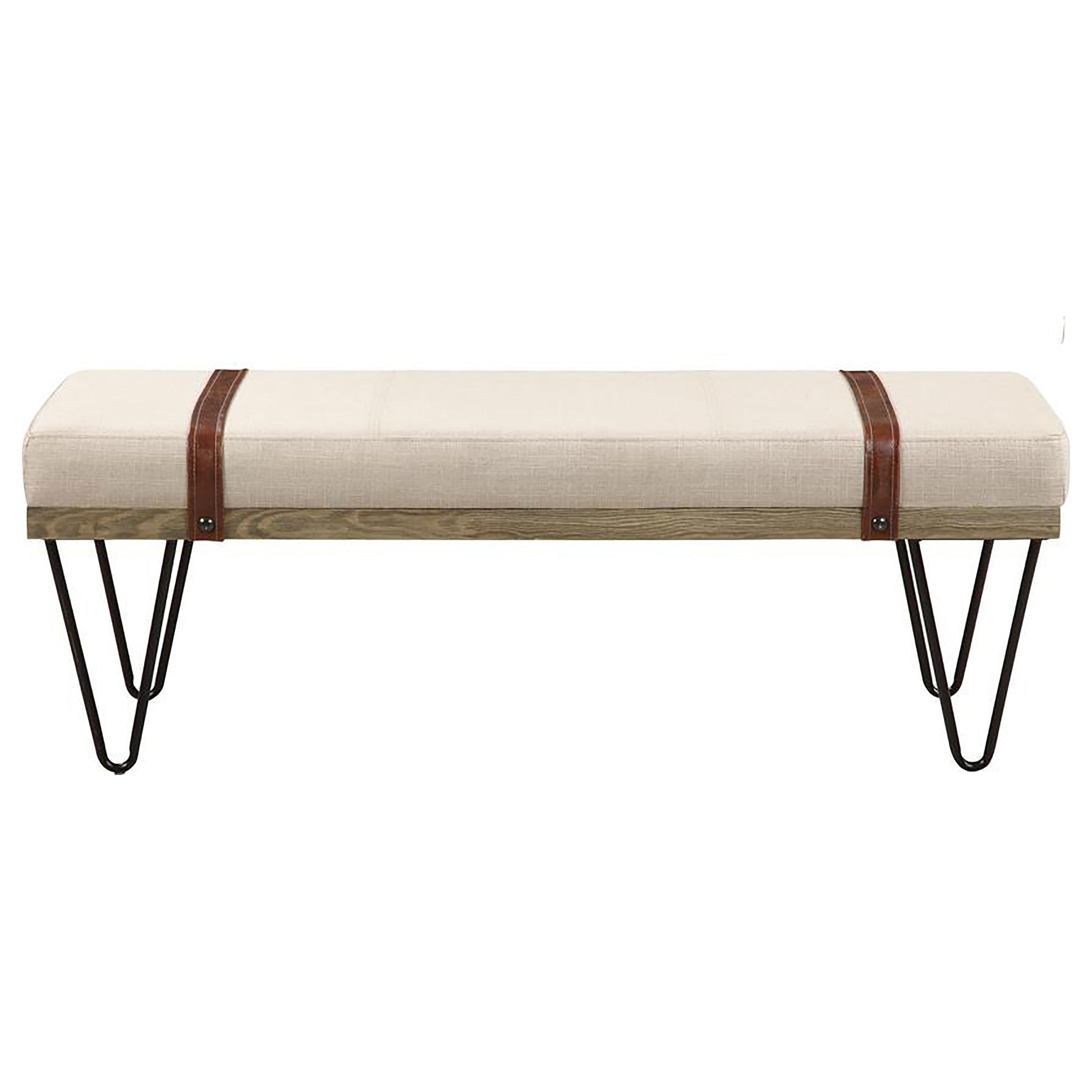 Dress up a living room with the interesting details from this modern rustic bench. Featuring open hairpin legs in a black finish, this bench marries a variety of design elements to make a statement. Classic colors, such as beige, add texture to the straight lines on the cushion. Rich and warm, straps adorn each side of the seat for an elevated feel. Subtle nail heads attach the charming design elements together to make this a versatile piece that transcends classic and contemporary motifs.