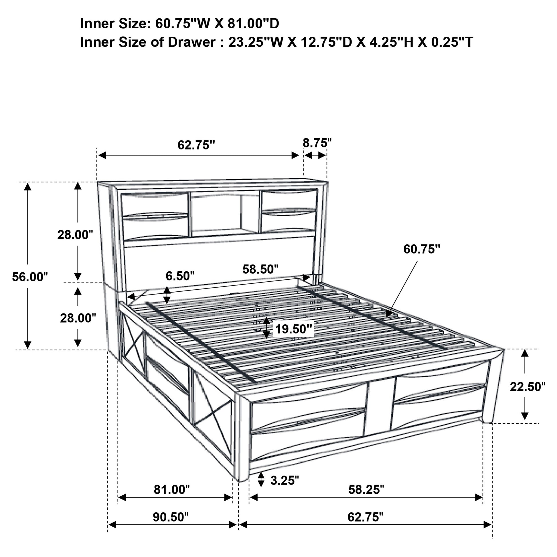 Transform your bedroom with this sophisticated storage bedroom set that combines timeless style and practical function. Finished in sleek black, the platform bed features four drawers in the footboard and hidden compartments behind drop-down doors on the headboard and side rails. The bookcase headboard includes four drawers and a center shelf for accessible storage. Complementary case pieces echo the look with chambered drawer fronts and brushed nickel hardware, creating a refined and cohesive space.