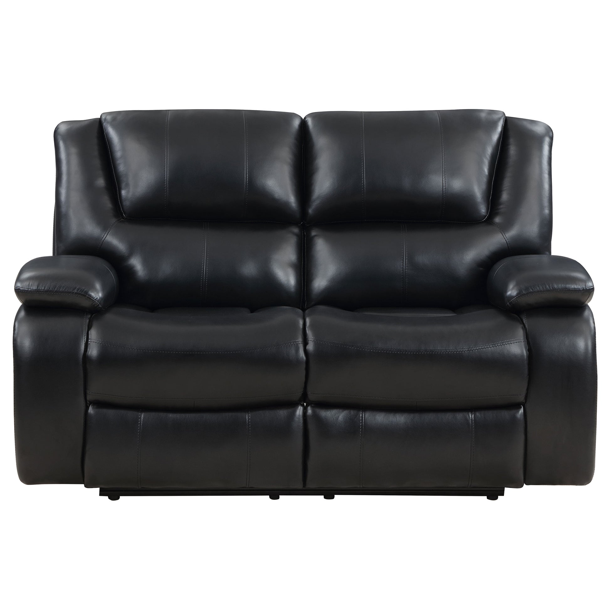 Bold black leatherette upholstery offers the look of luxurious leather with easy-care maintenance as the motion loveseat is versatile and beautiful. Living rooms, family rooms, and media venues become comfort zones with the plump feel and clean design of a classic loveseat built for hours of seating comfort as well as entertaining. Manual reclining is easy and pleasant, allowing a variety of positions for sitting and lounging. Choose this elegant loveseat with pillowy support, as the attached seat and back cushions feature plump foam filling with channeling to target body comfort and padded armrests over rounded sides. Entertain in style and sheer comfort with a motion loveseat that’s also ideal for solo lounging and napping.