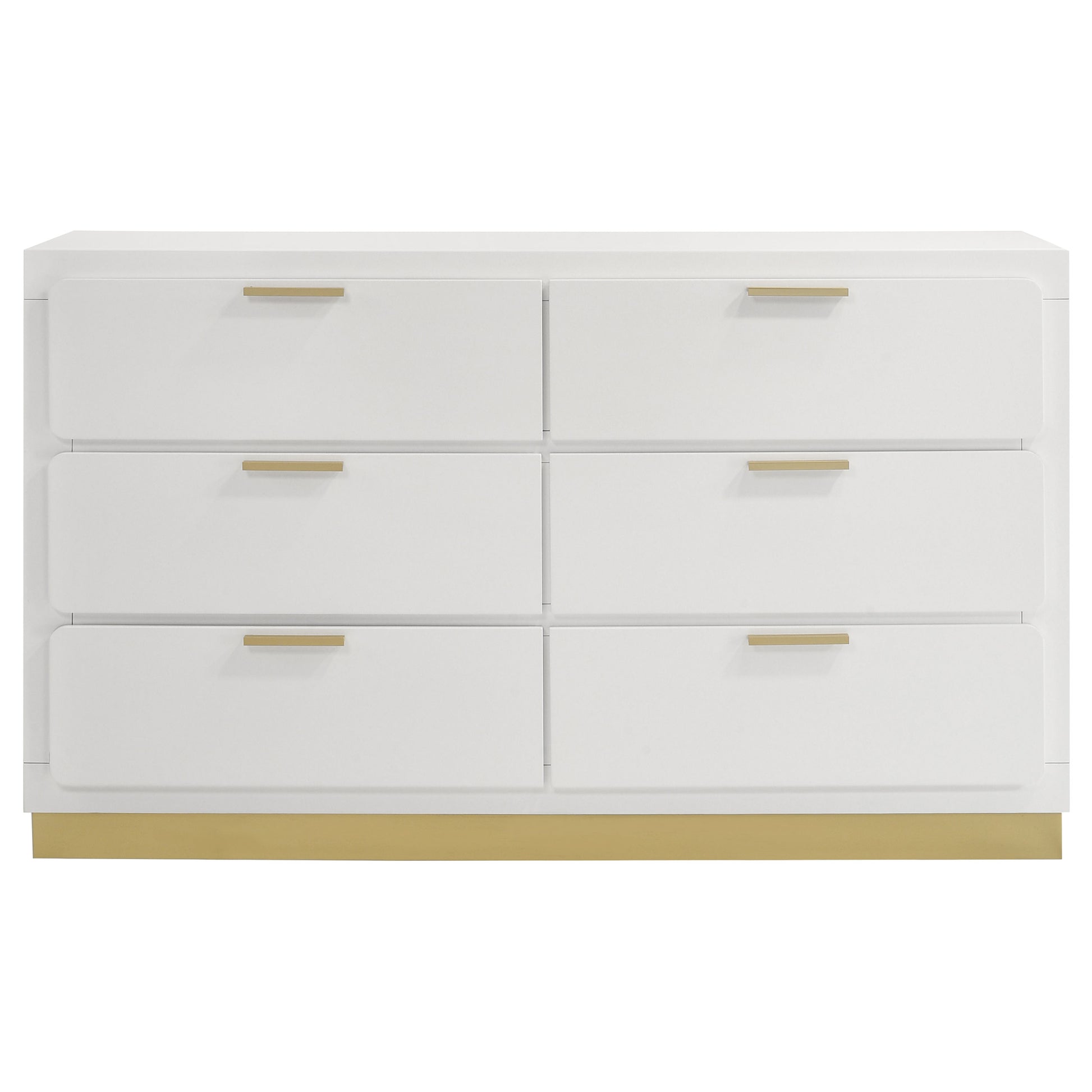 Modern luxury with a minimalist look offers a perfect fit for updated bedrooms as the six-drawer enhances a sleek master suite or guest bedroom. Wood and wood products construct a dresser with clean lines and a stylish Mid-Century Modern vibe. This dresser offers simplicity with sleek elegance, as accents include straight drawer handles and a matching base. Spacious drawers operate smoothly on center drawer glides. Choose this dresser for its versatility and convenience, accompanying either matching or coordinating pieces to pull a statement-making look together.