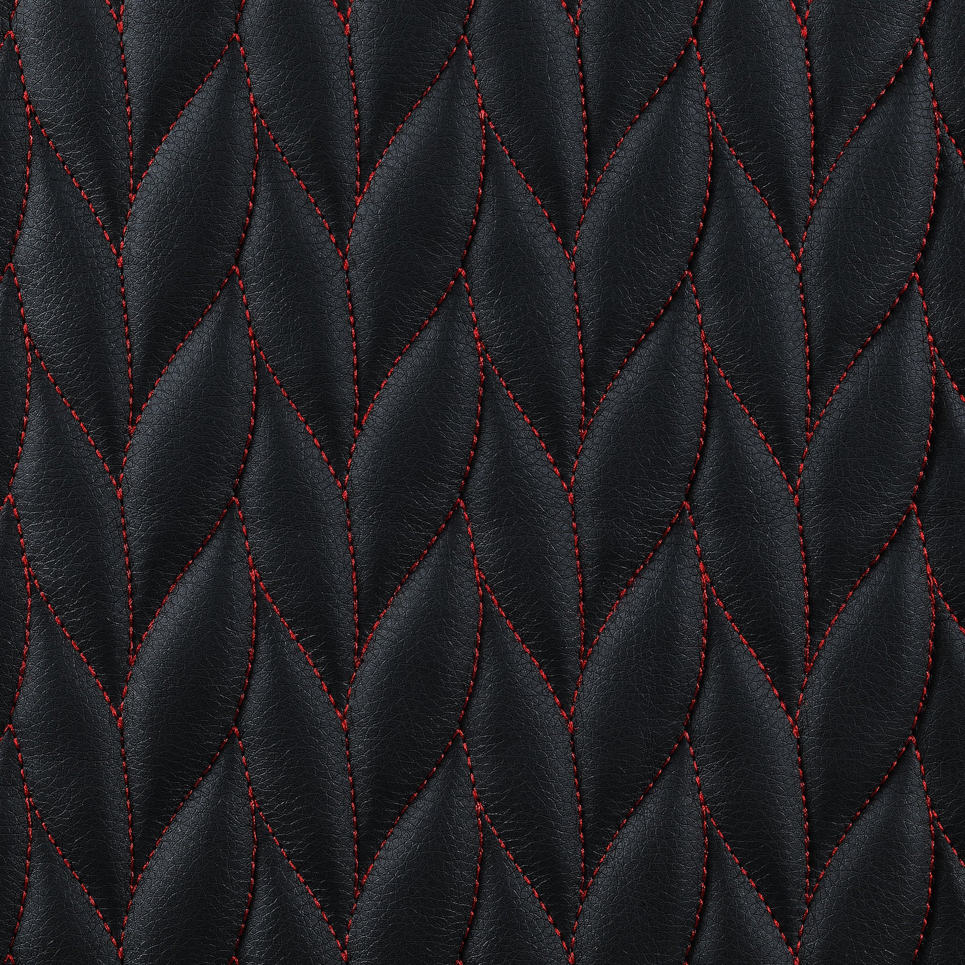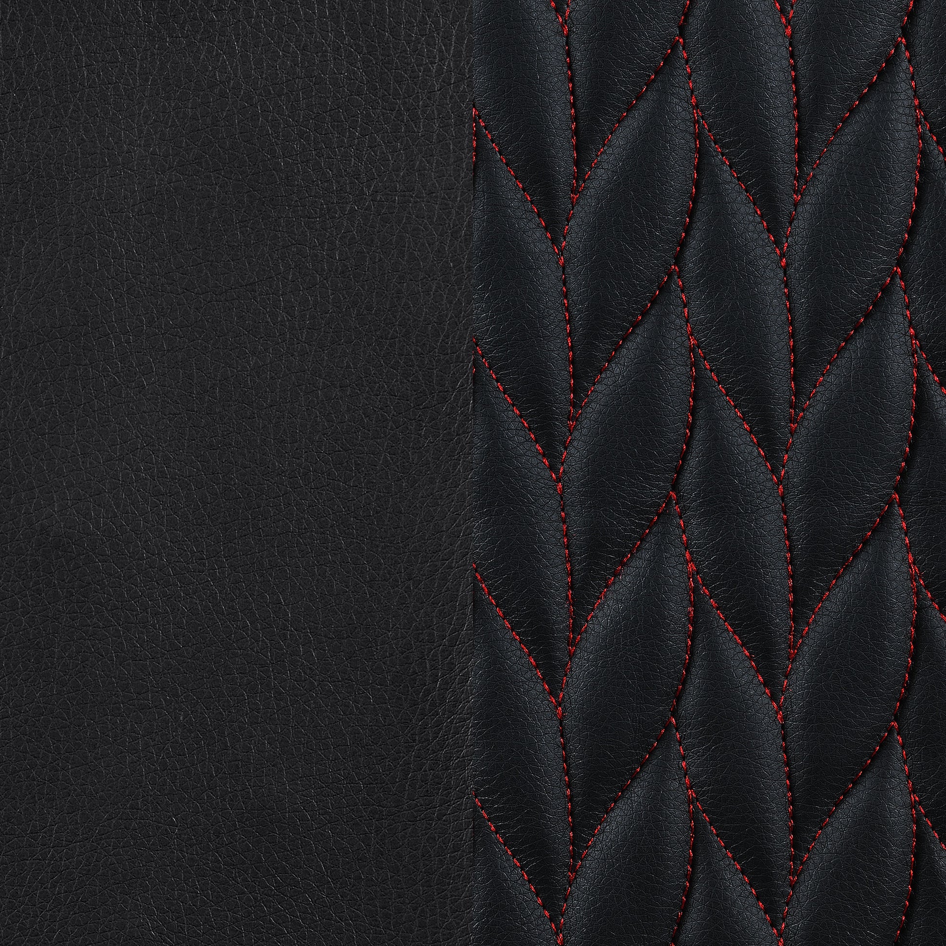 • Contemporary office chair wrapped in black leatherette with botanical-inspired herringbone pattern and red stitching details for a bold statement piece