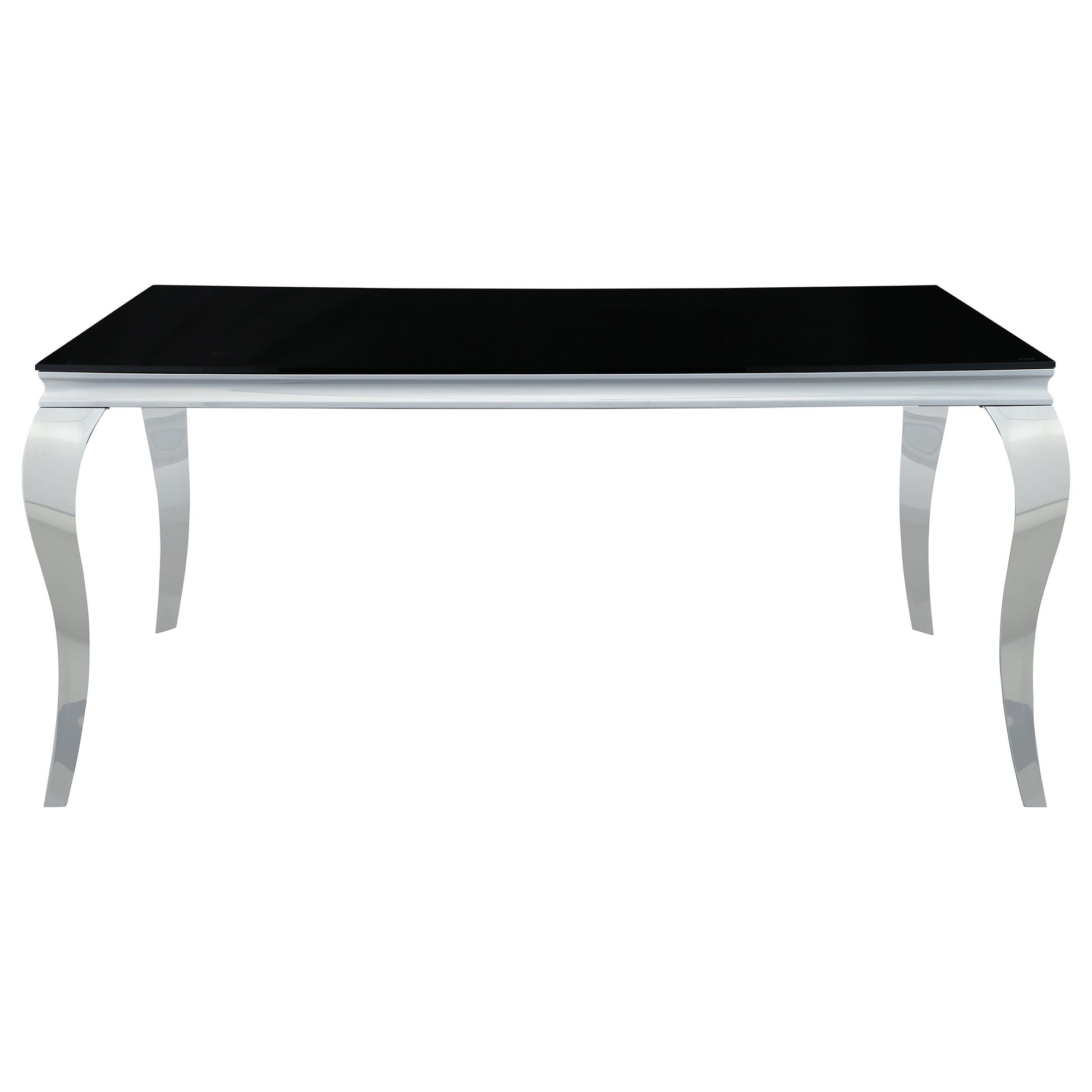 Experience the Carone dining set, seamlessly fusing modern design with timeless elements. The table's stainless steel legs bring sophistication, curving artistically and contrasting the 12mm tempered glass top with beveled edges. Hosting formal feasts is effortless on this table. Complementing this, the elegant dining chairs exude sleek sophistication. Their chrome-finished legs, including creatively curved front legs, offer a captivating shine. Luxe velvet upholstery graces the seats, available in various colors to personalize your space. Elevate your dining area with the Carone collection, where innovation meets opulence.