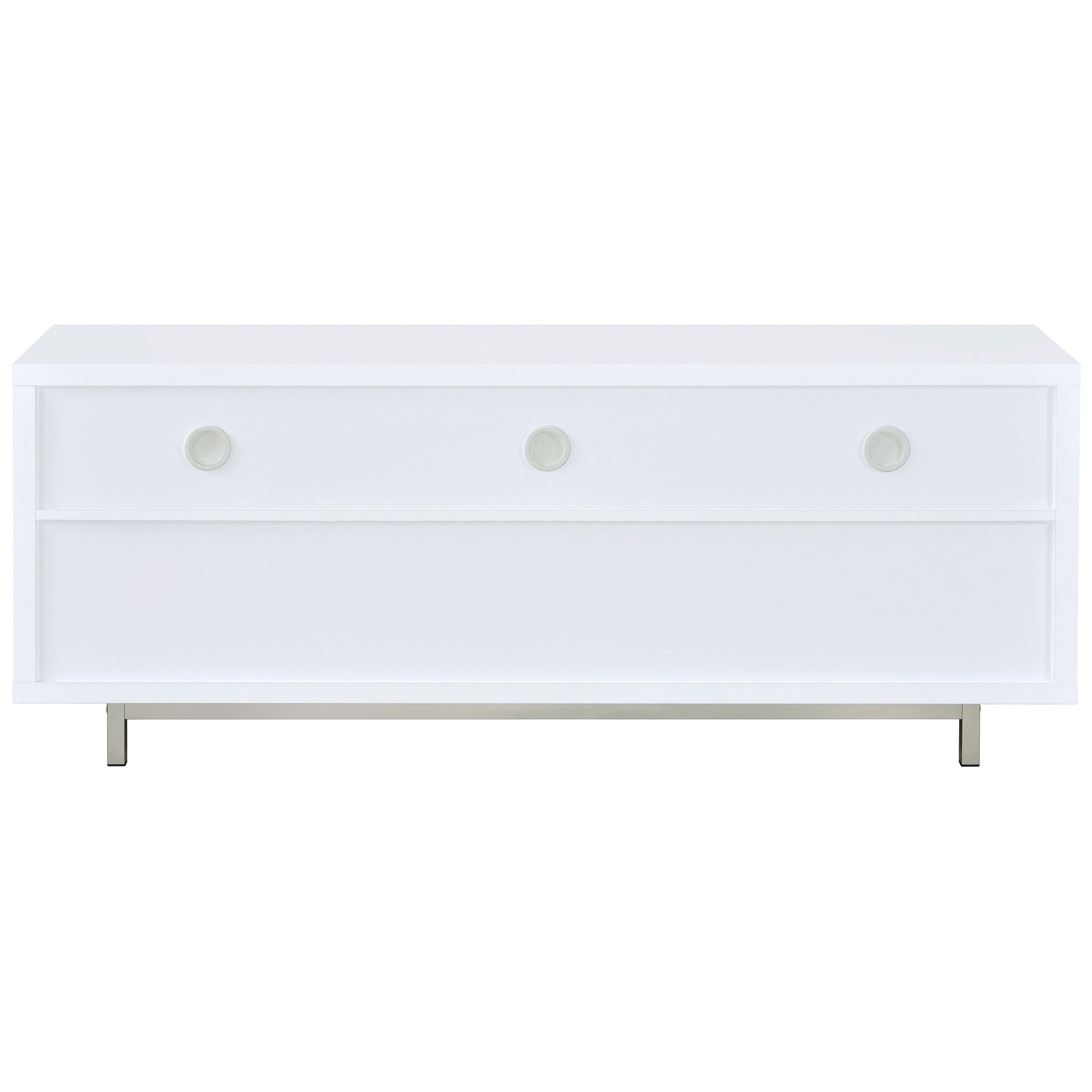 Ideal for a living room with contemporary decor, this TV console exudes updated style. The dazzling shine of chrome combines with a crisp, clean white finish for a pleasingly modern look. Its chic silhouette is complete with an elegant brushed silver frame, adding a pleasing touch of polish. Endlessly versatile, it features three open storage compartments and two large lower drawers to easily keep your space organized. For added depth and a more subdued look, this console is also available in deep, rich cappuccino.