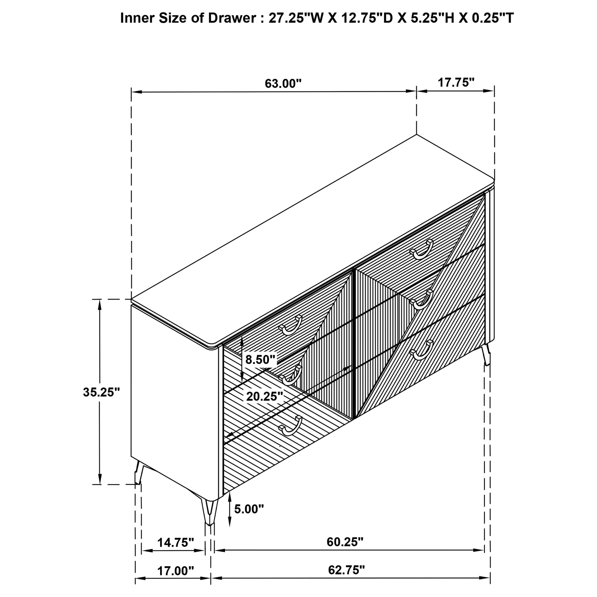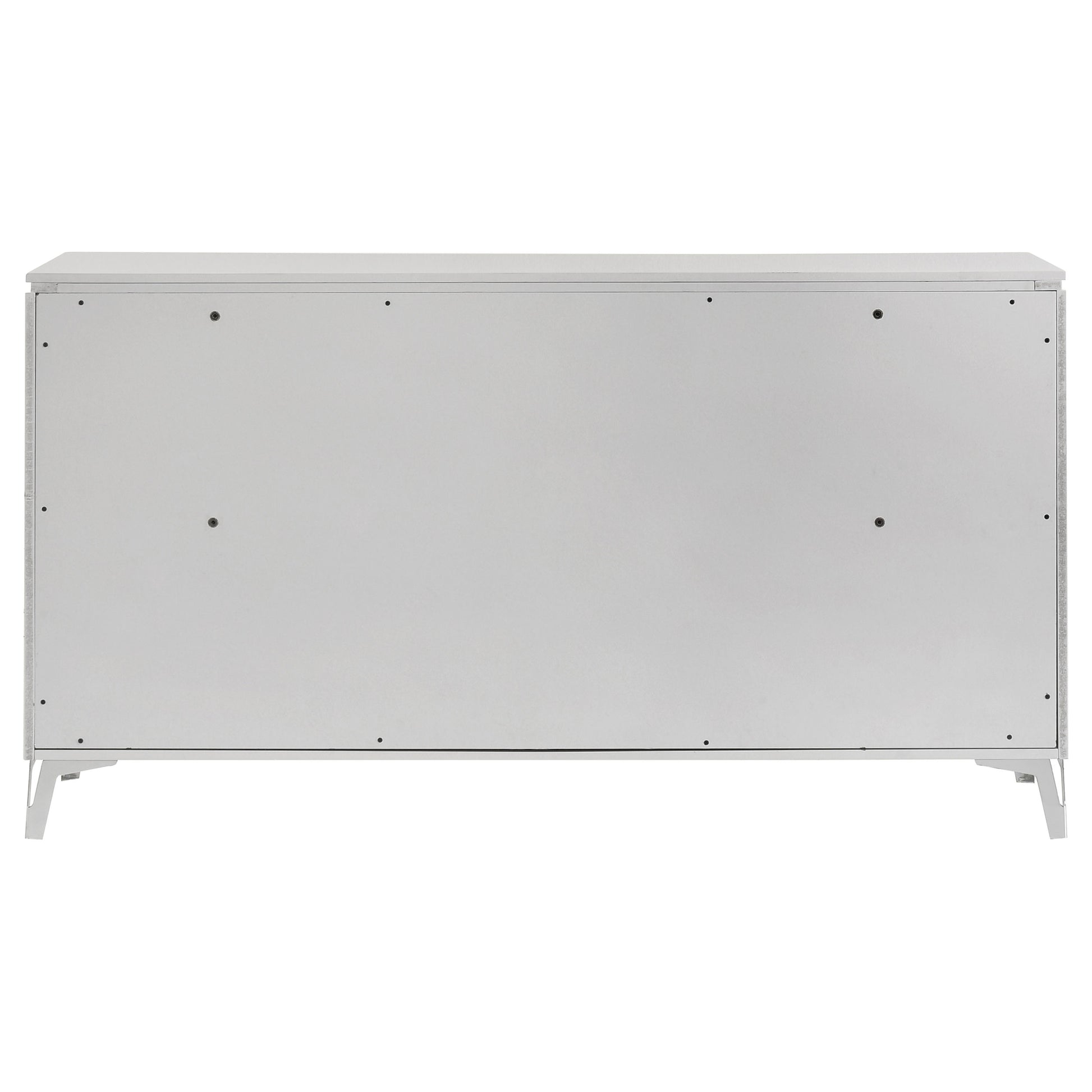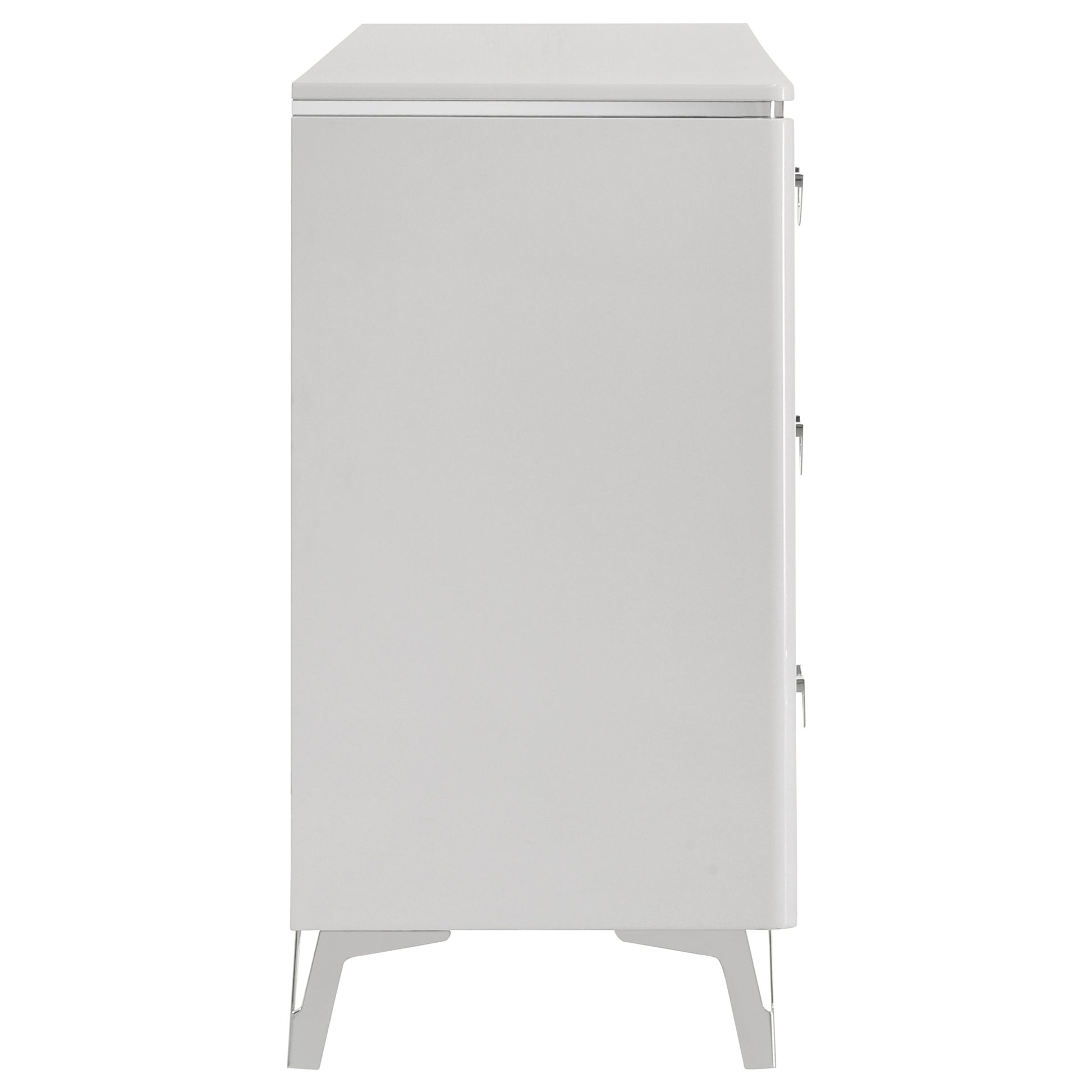 Sleek and sculptural, this six-drawer dresser pairs crisp white high gloss with dimensional detail for a bold modern look. Its geometric drawer fronts feature ribbed textures forming inverted V patterns, highlighted by polished chrome U-shaped pulls. Felt-lined top drawers add a refined interior touch, while smooth-gliding drawers operate on 45mm metal extension glides hardware. Finished with slender legs and clean lines, this dresser brings texture and brightness to contemporary bedrooms.