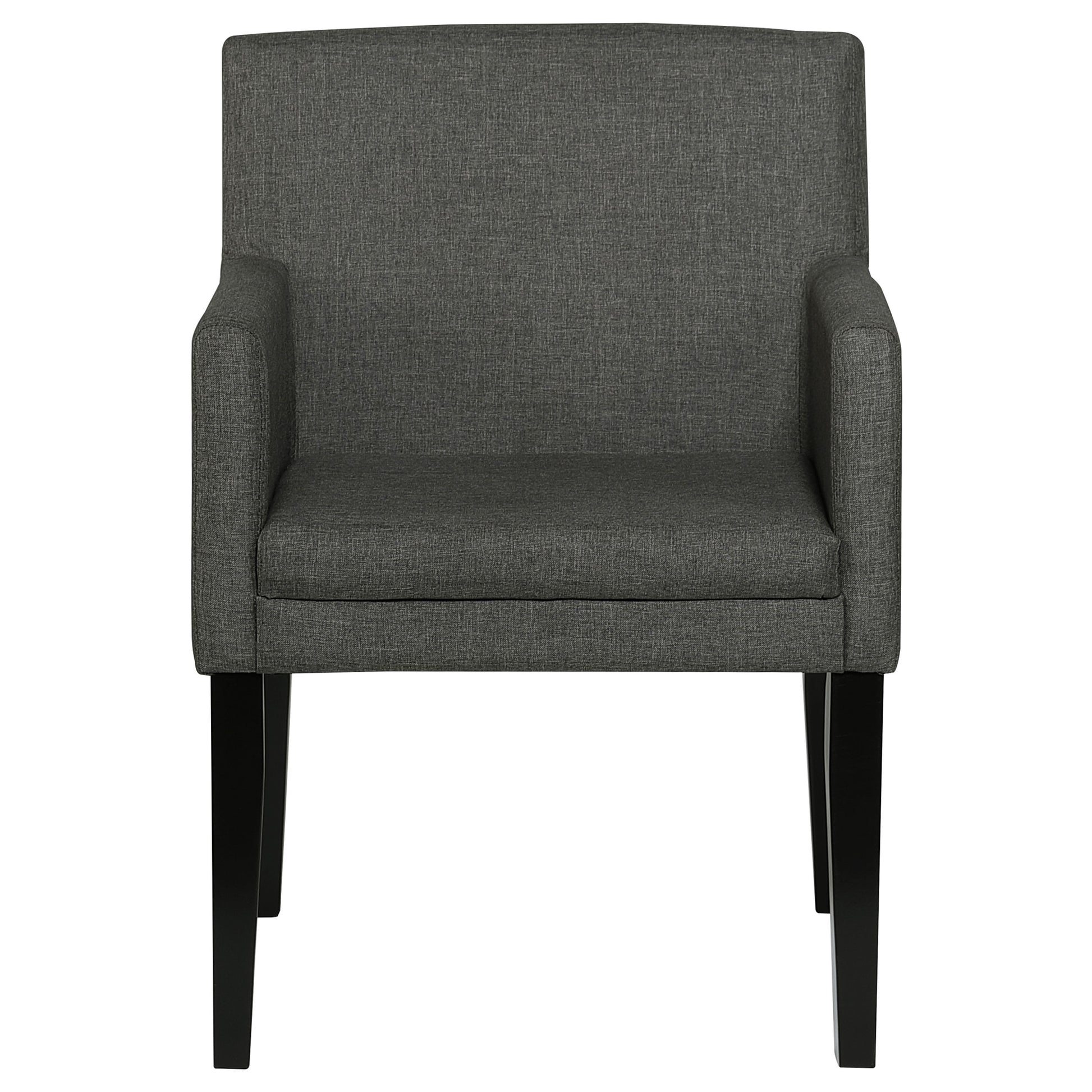 Enhance your casual dining room with these stylish mid-century-inspired dining chairs. Featuring cushioned arms wrapped in durable charcoal grey fabric, they offer both comfort and style. The sleek design and versatile color effortlessly complement any dining space, creating a cozy and inviting atmosphere. Elevate your dining experience with these chic and comfortable chairs.