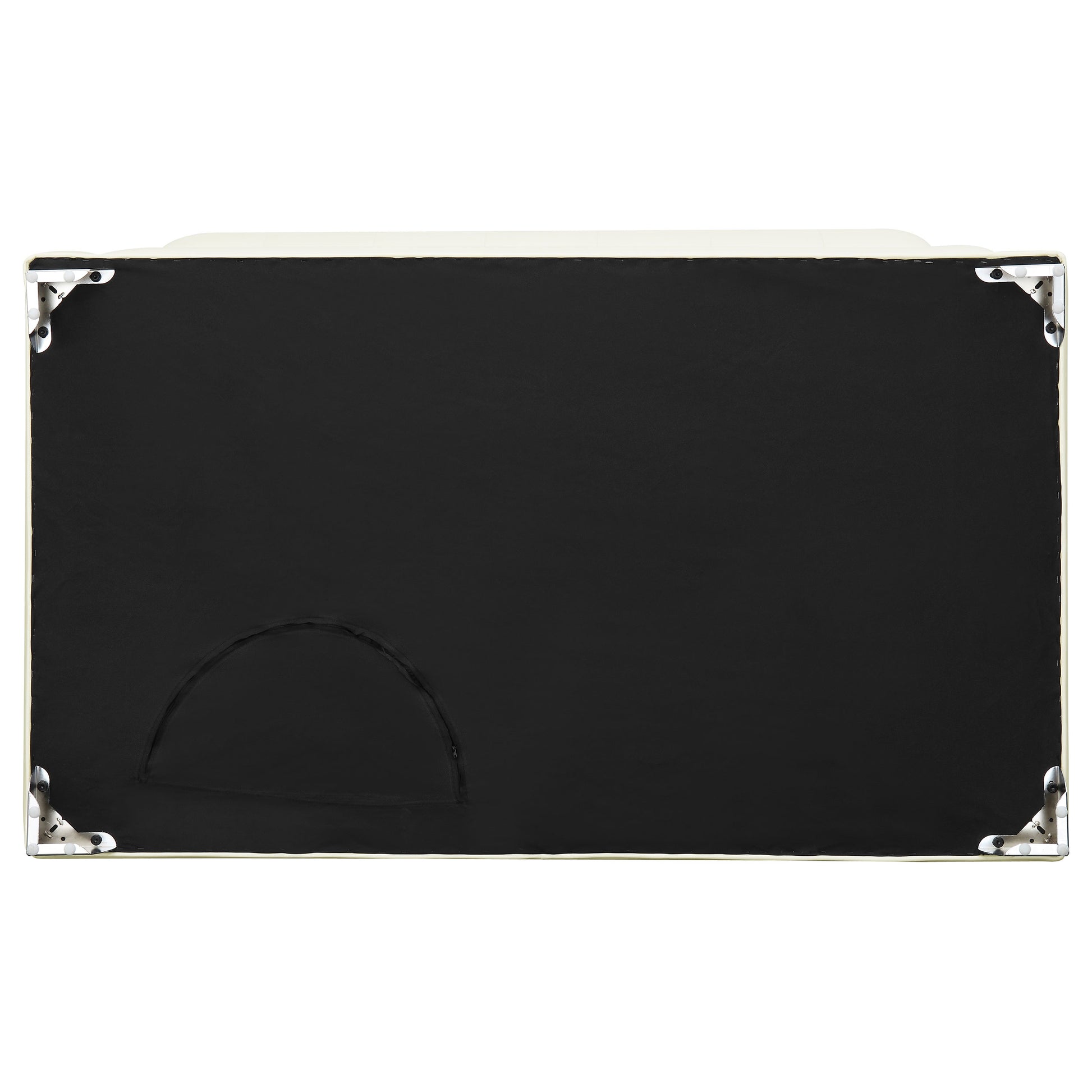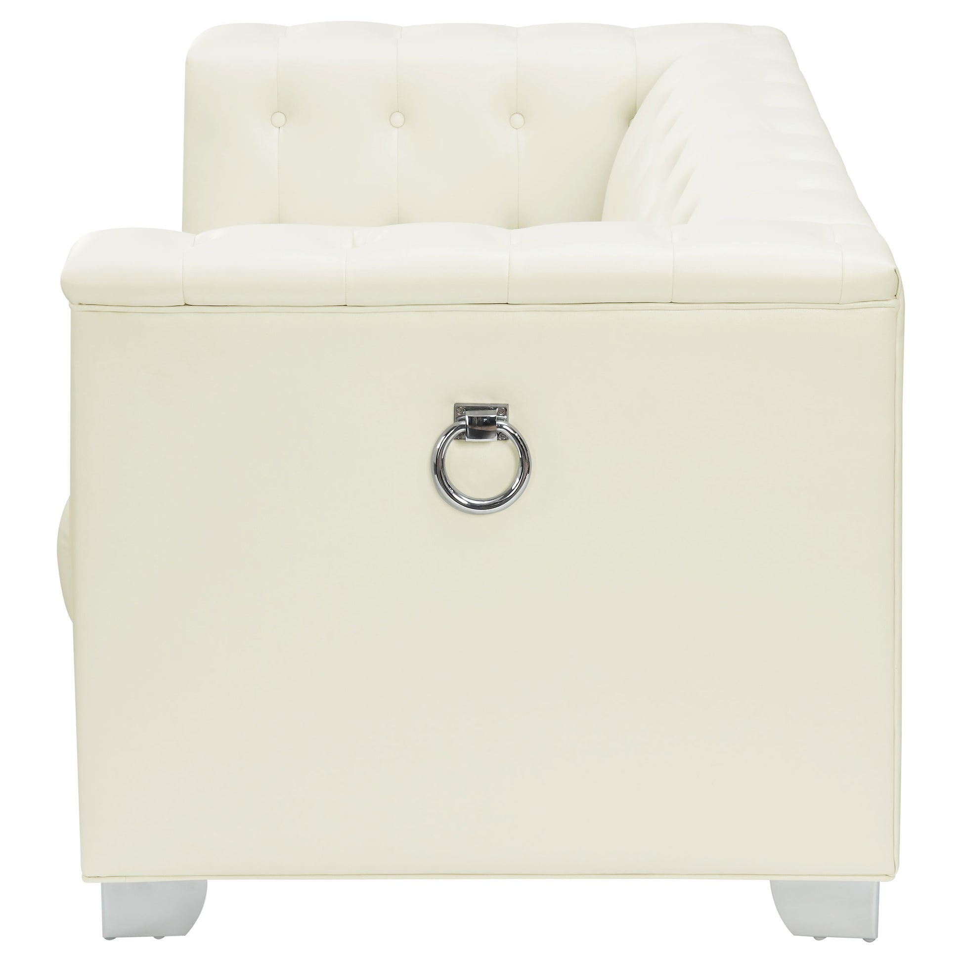 Add a dash of modern glamour to your living space. This sleek, stylish loveseat has a delightfully contemporary look. Heavy-duty chrome doorknocker handle accents give it an intriguing touch of artistry. Deep button tufting pulls its design together with fashionable flair. Upholstered in padded, breathable pearl white leatherette, this loveseat offers hours of cool, comfy relaxation.