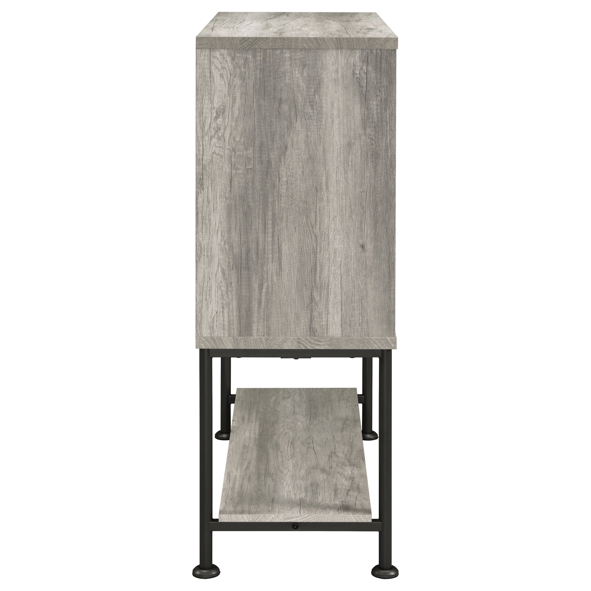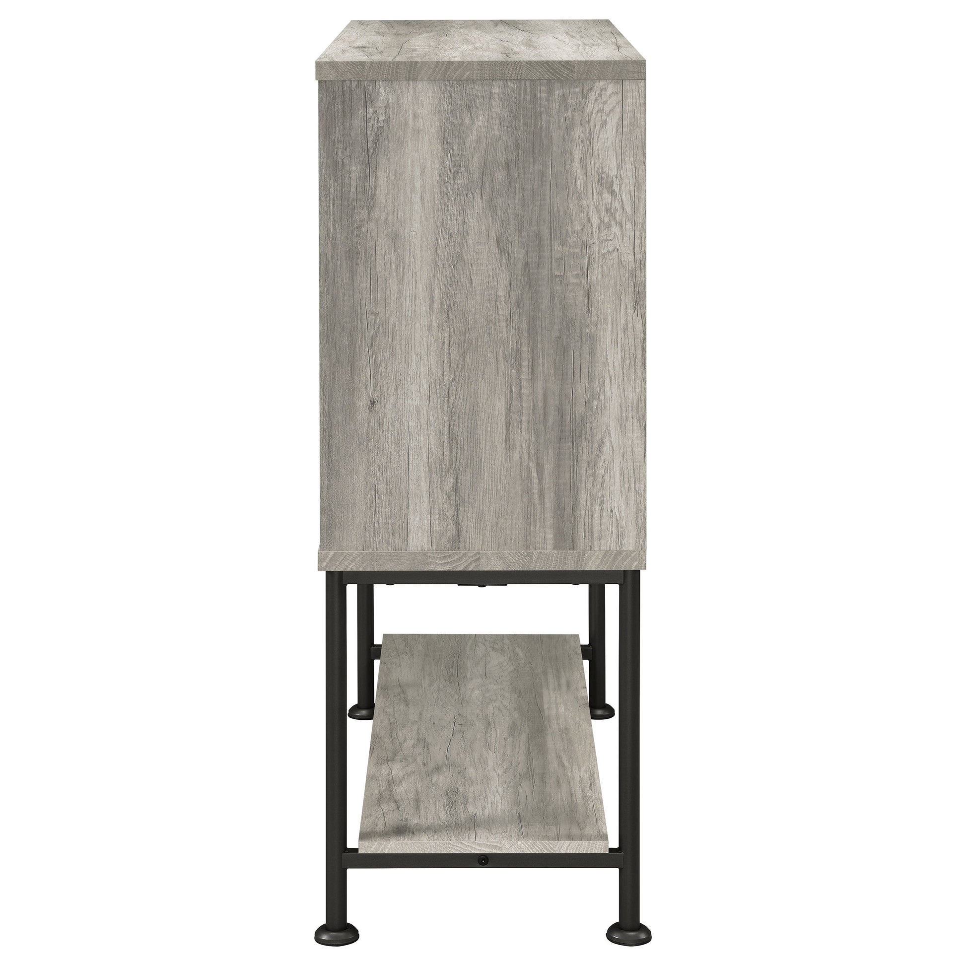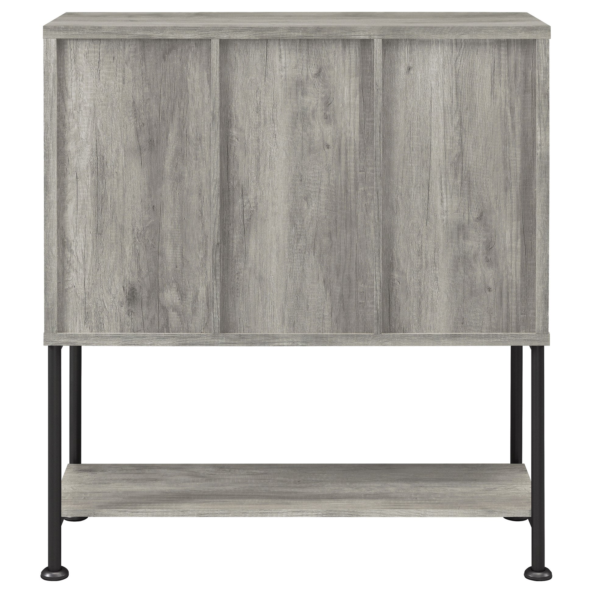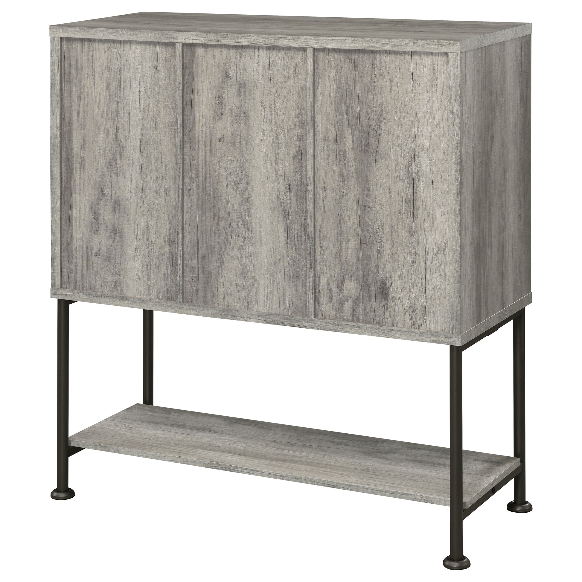 Perfect for a cottage or lakeside getaway, this bar cabinet features a light grey driftwood finish that is charming and cheerful. Place this bar cabinet in a rustic farmhouse home, as it offers country charm with two sliding barn doors that offer ample storage space. Crafted of a high pressure engineered veneer laminate, this bar cabinet is made to last for many years in the home. Plus, it offers one adjustable shelf behind each door. In addition, it has an open space to display favorite decanters and barware, along with a stemware rack mounted above and a six bottle wine storage.