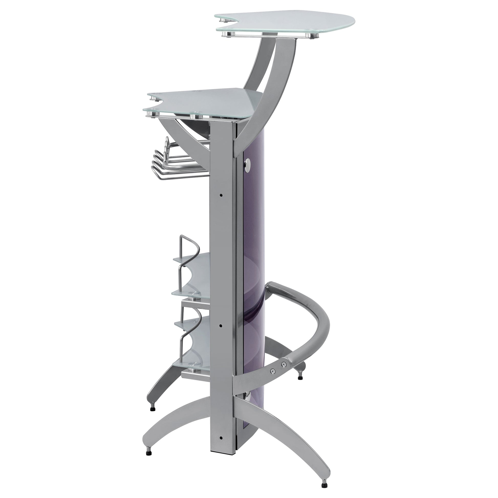 From fancy dinner parties to laid-back barbecues, this magnificent metal bar unit is the perfect upgrade to any room where guests may gather. Its versatile design provides a variety of convenient options for your entertaining needs. The contemporary curves of its metal frame add a sleek, sophisticated aesthetic, while transparent smoked acrylic panels put your glassware collection on proud display. A frosted, tempered glass top finishes off its bold, modern look. Featuring a handy metal rack for stemware and multiple shelves, this unit easily accommodates a wide variety of bar accessories.