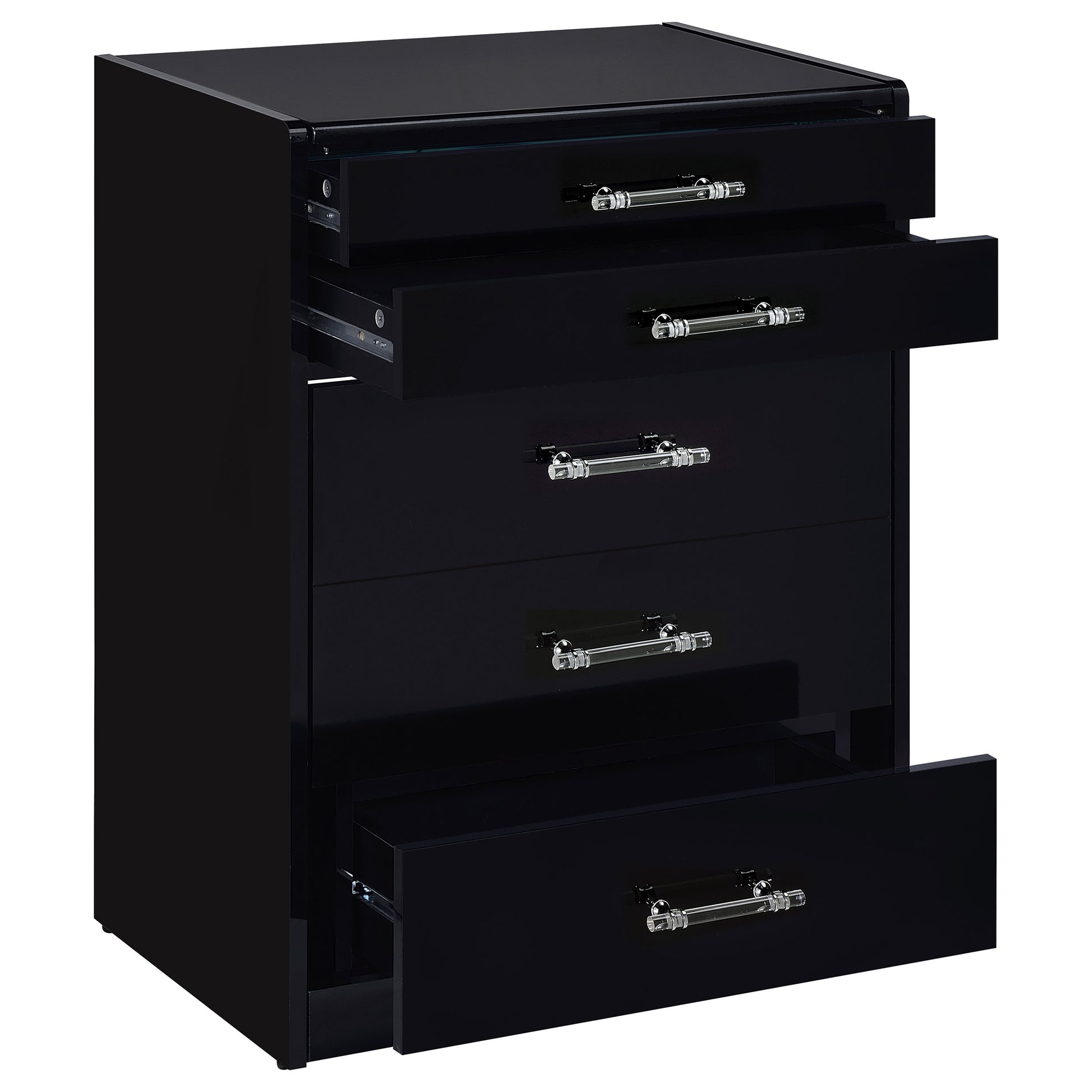 • Clear acrylic with chrome pull handles add a modern, elegant touch