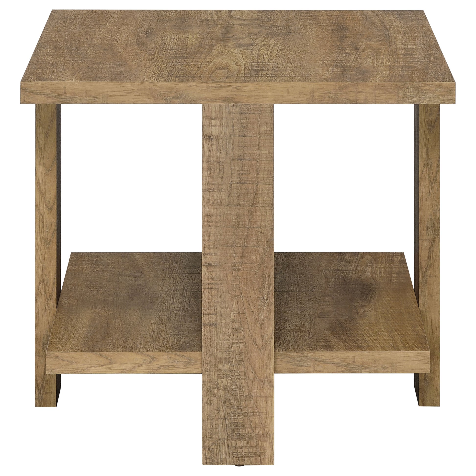 An effortless look of organic simplicity adds intrigue to your casual modern space, offering a place to display and serve as needed. This square end table is built of mango finish laminate veneer over engineered wood with an authentic rough sawn look. Rustic and inviting, it suits your thirst for style and functionality with two surfaces. Wide board-like legs complete its linear design. Embrace a crisp vibe in a side table devoted to earthy organic beauty.
