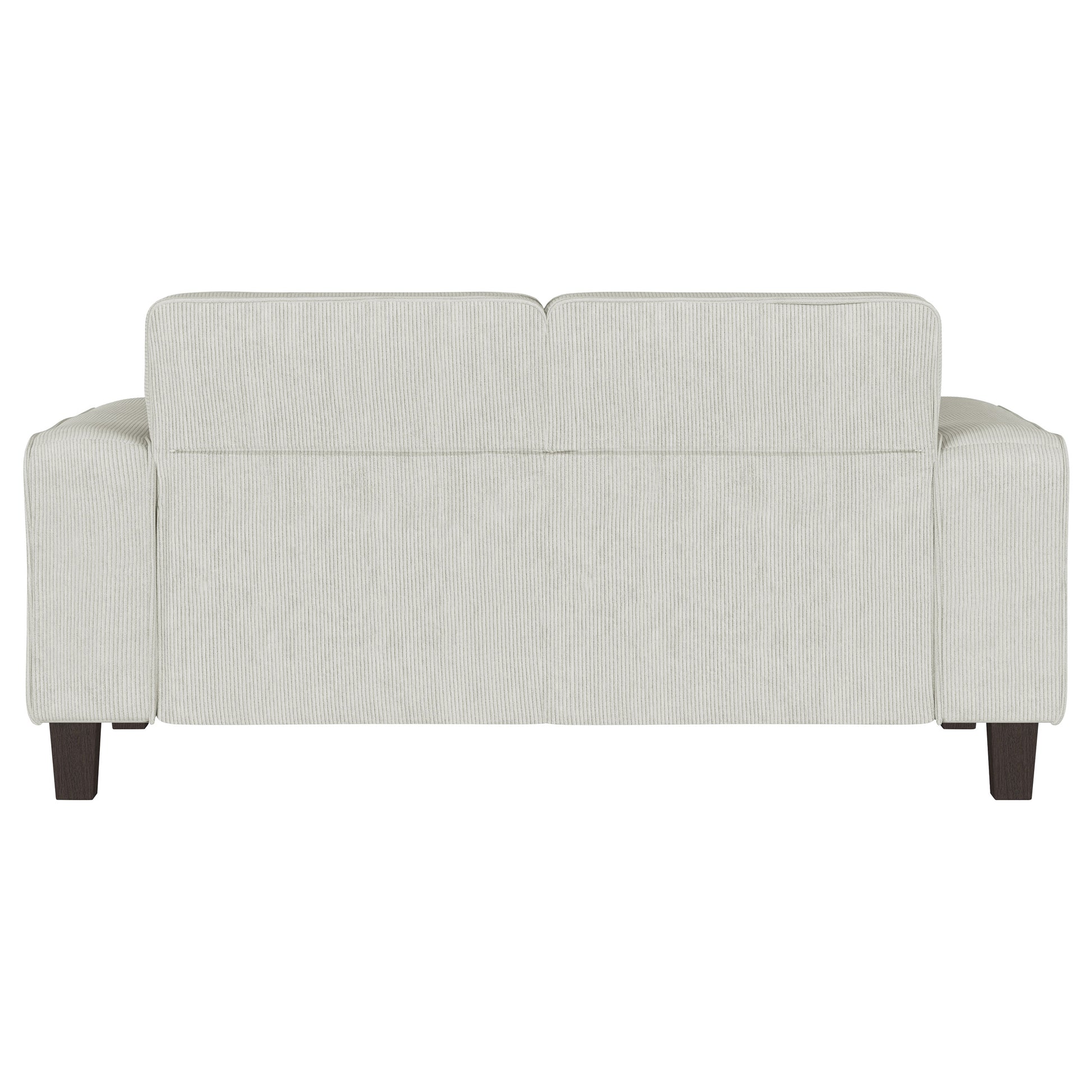 Inject impressive comfort and impeccable style with a modern loveseat in your living room or den. Its tufted back cushions add depth and dimension, perfect for a touch of character in your living area. Plush, soft upholstery in a neutral hue complements perfectly, offering inviting comfort and style with corduroy-like texture. Wide track arms add structure to a clean-lined silhouette, offering timeless flair that blends in any setting. Tapering wooden legs complete the look, offering height that create a touch of light, airy ambiance that delivers a modern design.