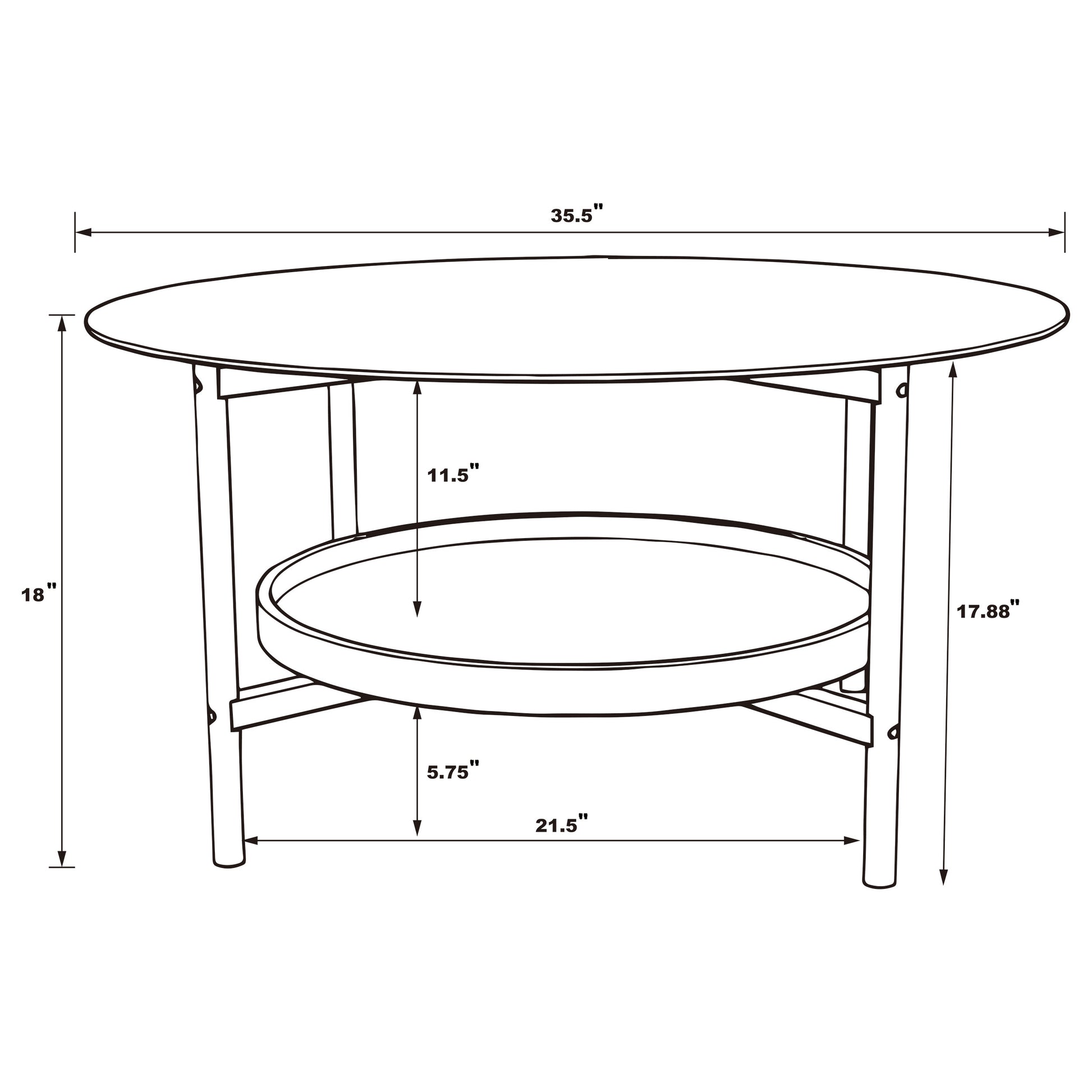 Center your living space with this inviting transitional coffee table that combines farmhouse charm with modern elegance. The X-cross frame is exposed beneath the round tempered glass top, adding dimension and visual interest. A black finish disc at the intersection of the frame offers an artistic touch, grounding the design. Below, the tray-style shelf features a warm brown wood grain finish with laminate veneer, providing both style and function with a subtle contrast to the glass and metal elements to this cocktail table.