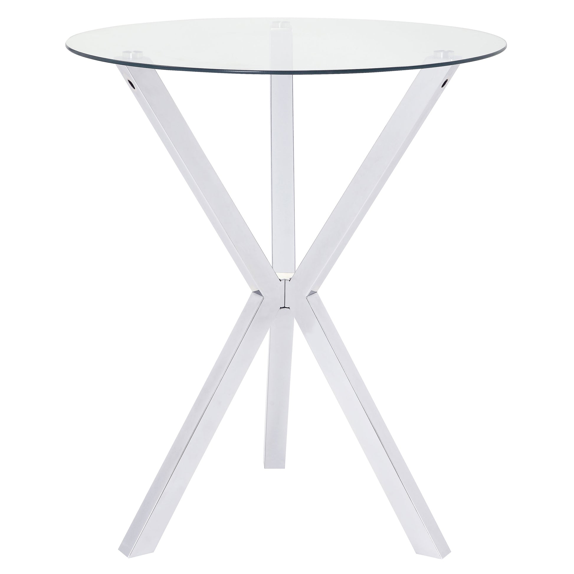 This contemporary bar table adds a touch of simple sophistication to a kitchen or breakfast nook. It features a bold X-shaped base in a shining chrome finish, giving it a sleek, striking appearance. A round glass top completes its elegant look. Modern and stylish, this table is perfect for relaxing with a glass of wine after work or enjoying an intimate meal with someone special. Pair it with matching swivel bar stools for extra comfort and style.
