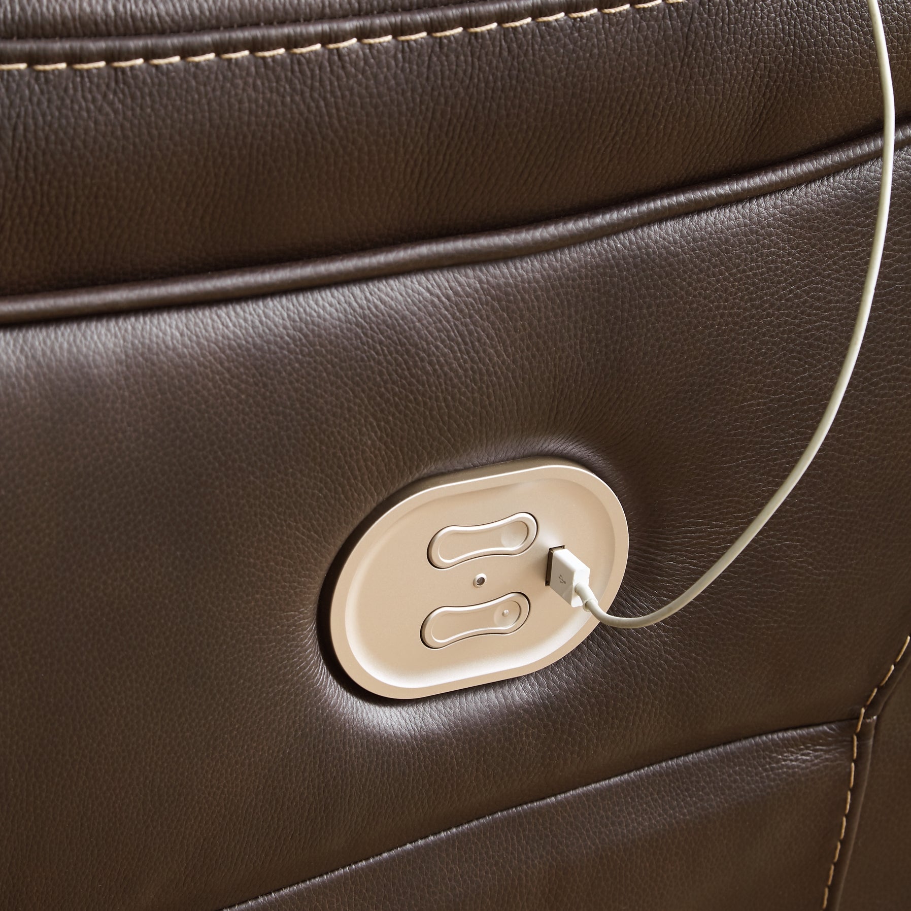 Load up on comfort in a cool, clean-lined and contemporary way with this zero wall recliner with power headrest. Rest assured, the expertly matched leather and faux leather upholstery is enriched with a pebble grain effect for authentic appeal and enhanced with jumbo stitching for dramatic contrast. It features a one-touch power control with adjustable positions and includes an Easy View™ adjustable headrest that allows a primo view of the TV even when you're reclined. The extended ottoman provides extra length for leg comfort. A zero-draw USB plug-in at your fingertips lets you charge up as you chill out.