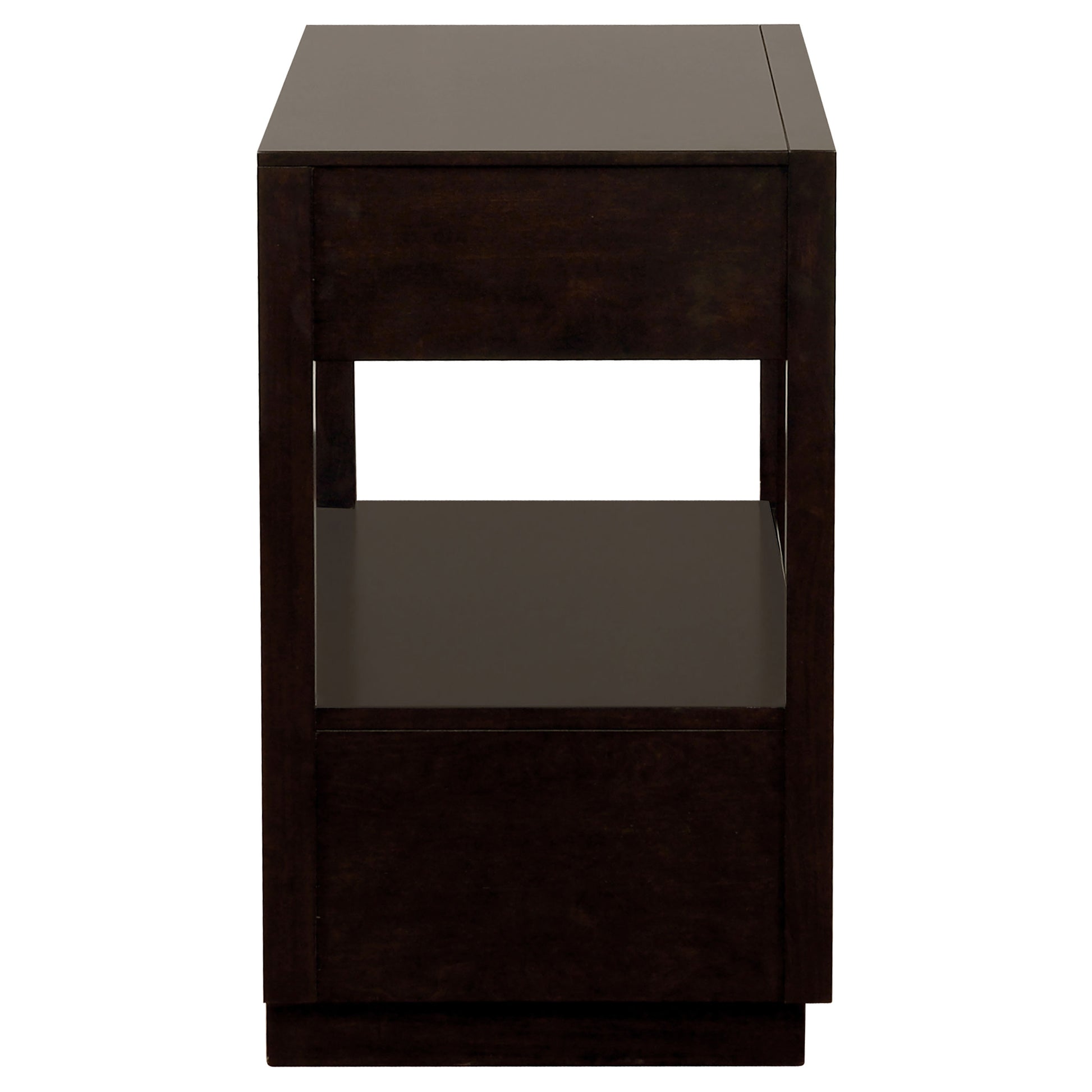 Inspire a retro feel in a modern bedroom with this stunning two-drawer nightstand. Elongated metallic drawer pulls protrude from flat drawer fronts, inspiring a sleek look. In a rich and warm smoke peppercorn finish, the deep hues of the silhouette create a bold visual. The simple and smooth frame creates a structured effect, complete with a smooth base that reaches the floor. Store your bedtime books or favorite sculptures on the shelf between the drawers to add depth to your space.