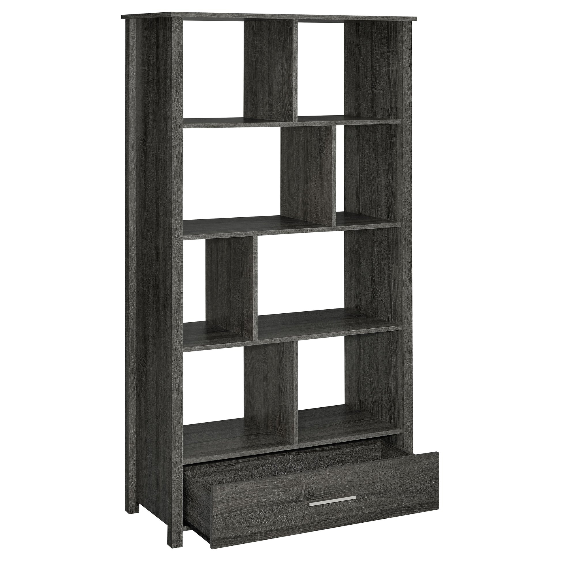 • Weathered grey contemporary bookcase with asymmetrical open cubbies