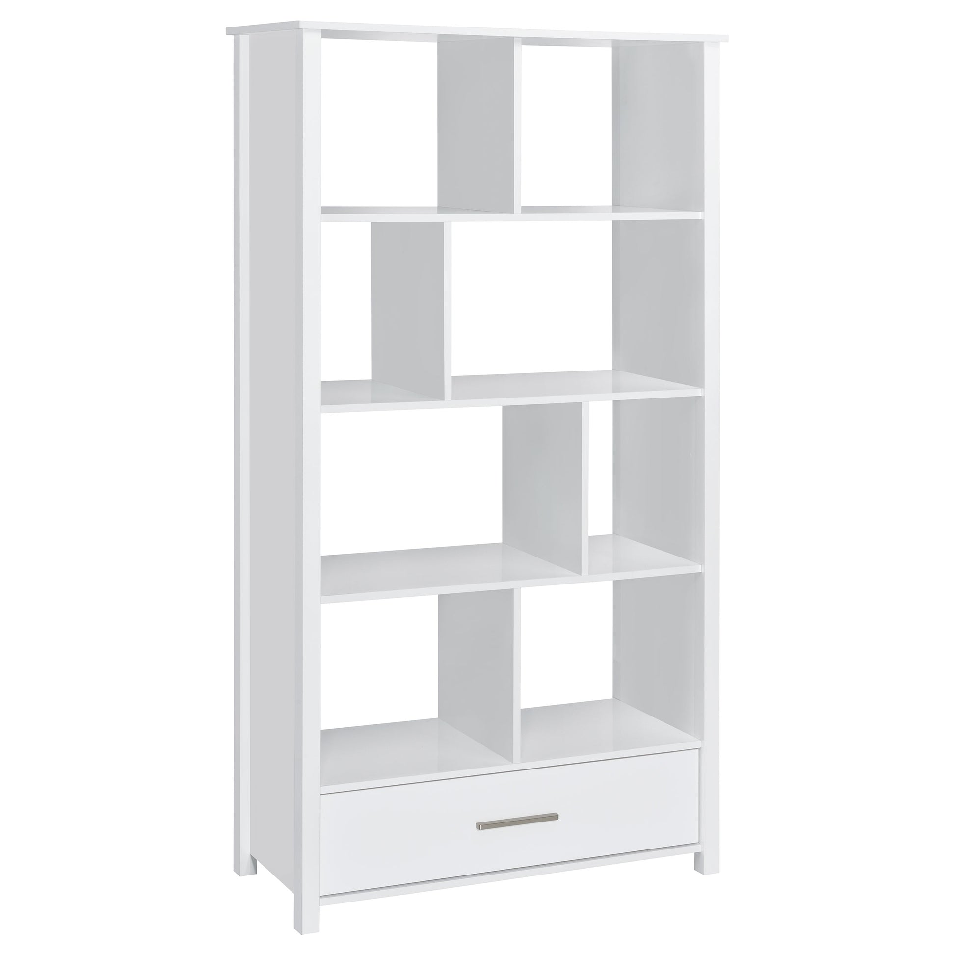 Asymmetrical shelves stack against one another to create this stunning, contemporary bookcase. A stylish, eye-catching addition to a home office, this minimalist bookcase invites you to organize office accessories or showcase decor and family photos. Eight separate sections divide items categorically if you wish, while a bottom drawer keeps items out of sight. The single drawer is adorned with a sleek, brushed zinc pull that further lends to the chic nature of this bookshelf. Versatile and functional, place this tall bookcase in the room of your choosing.