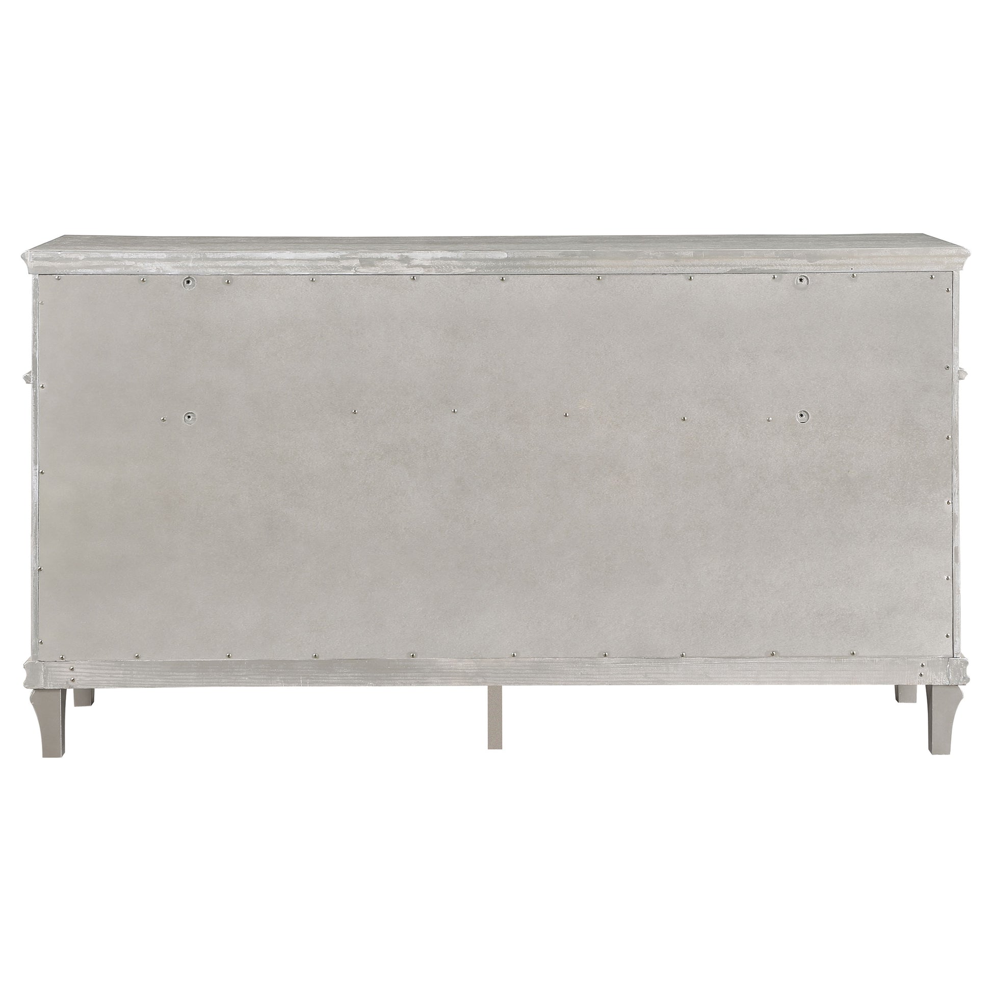 A silver oak finish creates an elegant touch to this glam nine-drawer dresser. Hexagon-shaped knobs and drop bail handles appointed with pearl accents adorn each of the nine spacious drawers for a luxurious look and feel. Keep delicate essentials organized within the grey felt-lined top drawers and garments in the deep bottom drawers. Across the dresser front is a curved facade that sweeps through the drawer fronts and ends at two sparkling column panels. Charming wood molding details along the top and bottom, along with intricate trim, offer a classical flair.