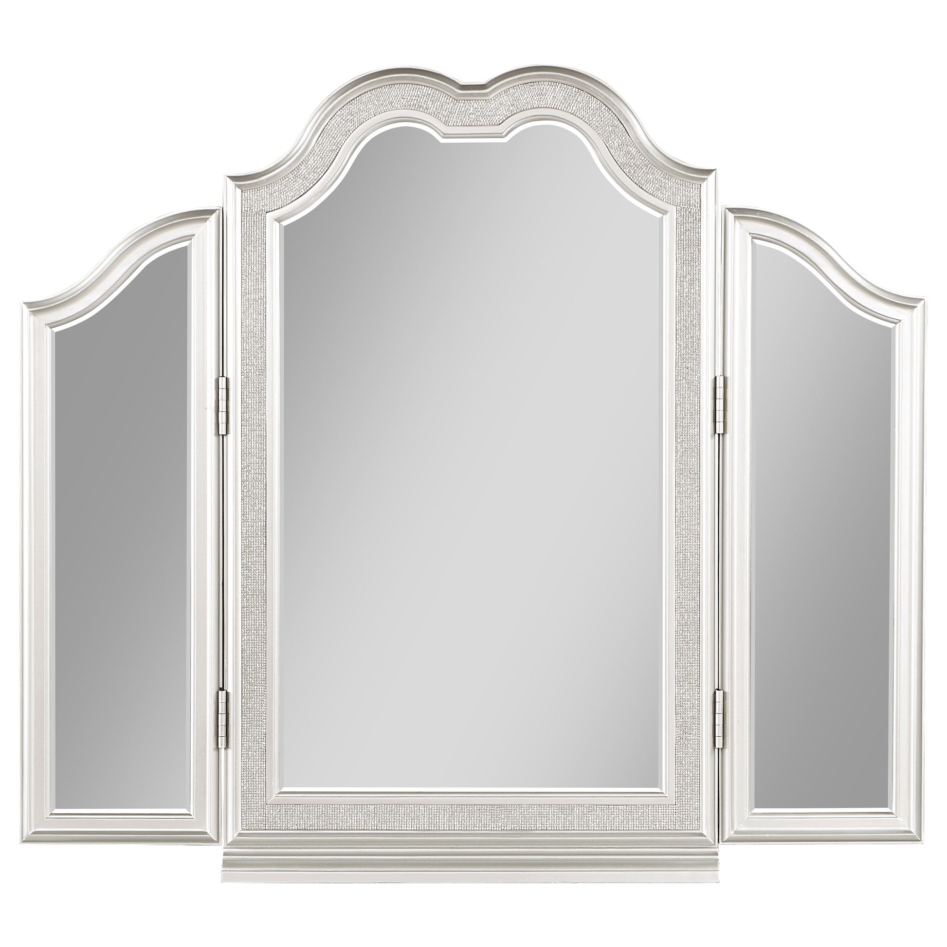 Your Evangeline collection vanity simply is not complete without this matching tri-fold mirror. Giving a great view from every angle, it's a necessity when creating gorgeous hairstyles and makeup looks, with side mirrors easy to position at just the right angle. The mirror is a shapely creation, offering romantic glamour in your dressing area or bedroom. Sparkling diamond-like trim highlights the center mirror, while beveled glass creates dimension and depth. A soft silver finish is a perfect match for the vanity desk, delivering sophisticated style for every occasion.