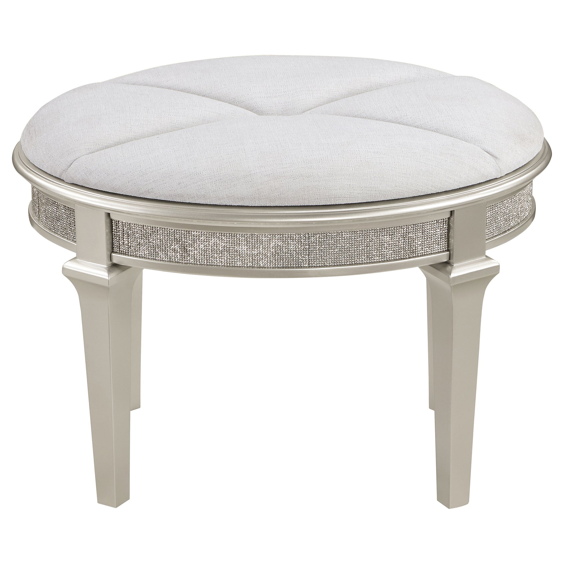 Sleek and sophisticated, this glam stool is the ideal finishing touch for the matching Evangeline vanity desk. Elegantly appointed, it boasts a chic oval shape complete with graceful tapered legs that provide durable support as you primp and prime for the day, or evening, ahead. Its padded seat shows off ivory chenille upholstery, offering just the barest hint of contrast to a soft silver frame finish. Glittering diamond-like trim adorns the apron of the stool, offering the ultimate in sophistication and refinement. When not in use, the backless stool tucks easily under your vanity desk, keeping your bedroom tidy and walkways clear.