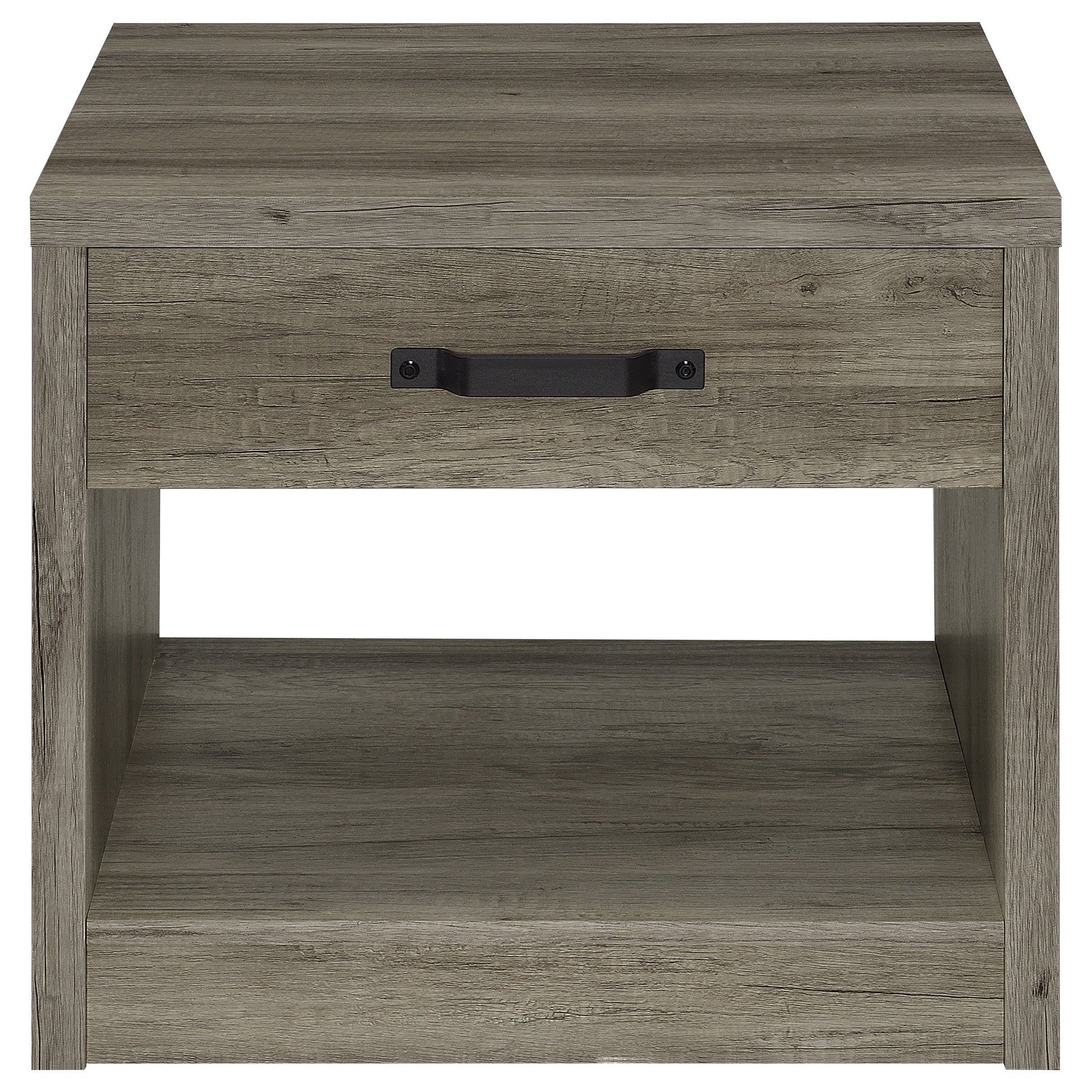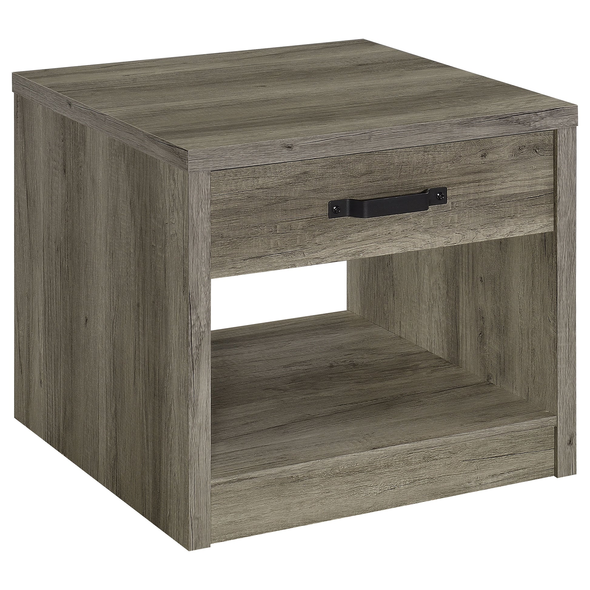 Bring rustic charm to your living room or bedroom with this versatile end table. Featuring a weathered gray finish over engineered wood and scratch-resistant veneer, it delivers a natural wood-look design. The table includes a spacious drawer with a bold black metal handle and an open shelf for additional storage or display. Its clean lines and practical design make it a perfect addition to casual and modern interiors.