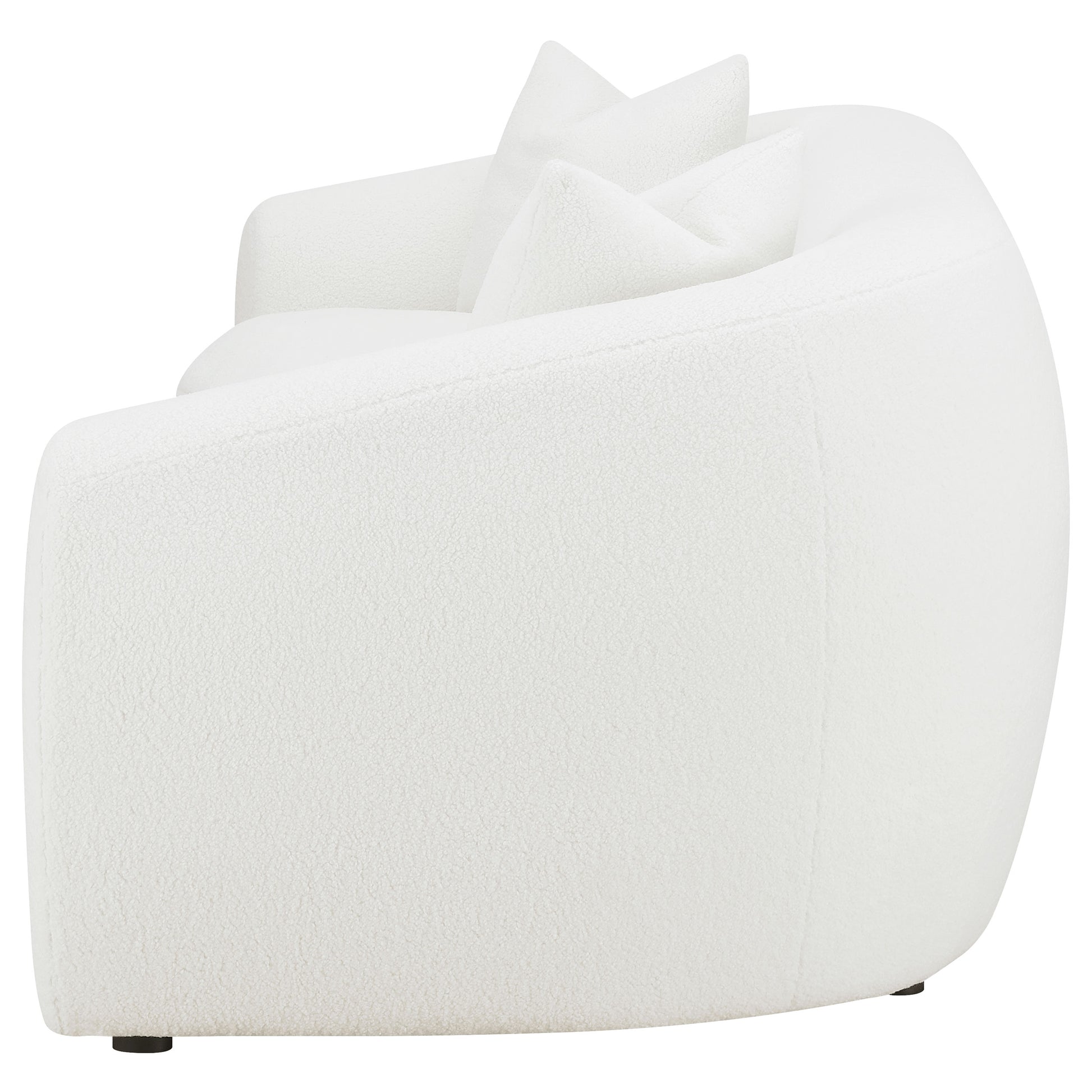 Bring modern warmth and soft texture to your home with this elegantly curved sofa. Upholstered in a plush faux sheepskin boucle fabric, it features smooth contours and sloped armrests that create a sculptural, contemporary silhouette. The tight back and plush bench seat provide comfort and support, while matching accent pillows filled with faux down add cozy refinement. Perfect for living spaces that blend modern design with inviting comfort, this sofa offers timeless style and everyday luxury.