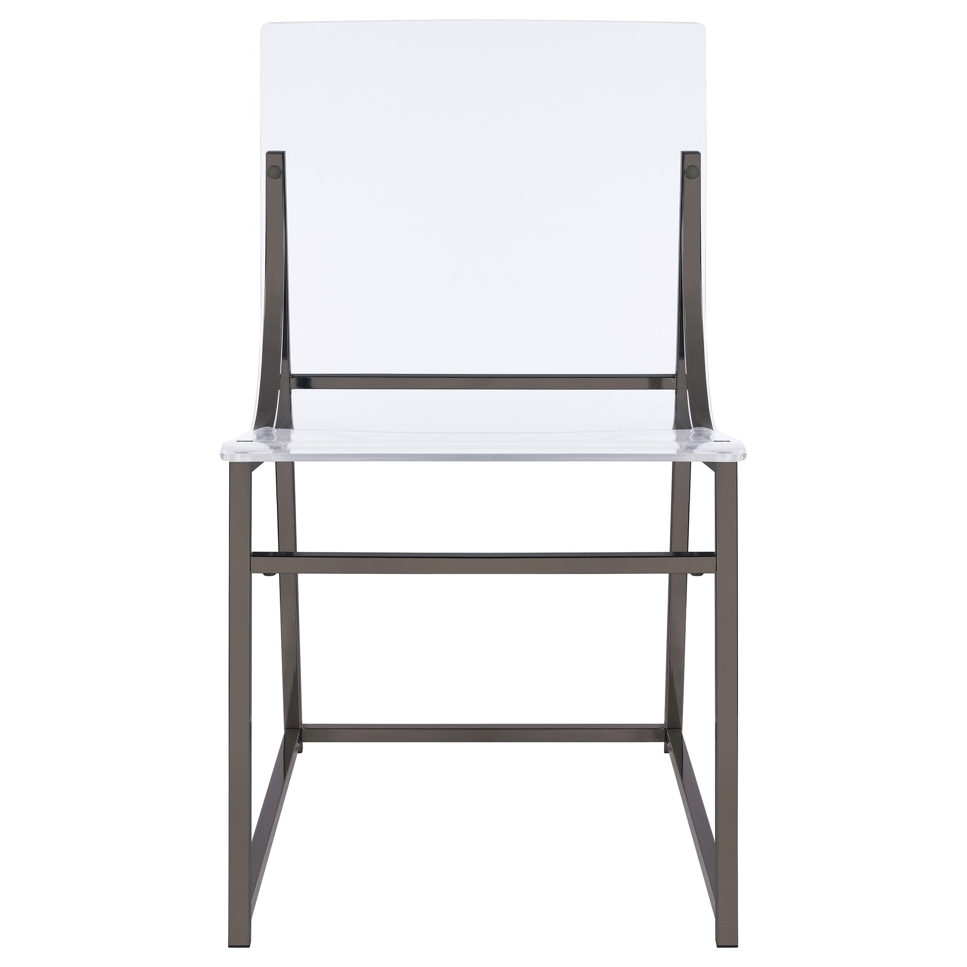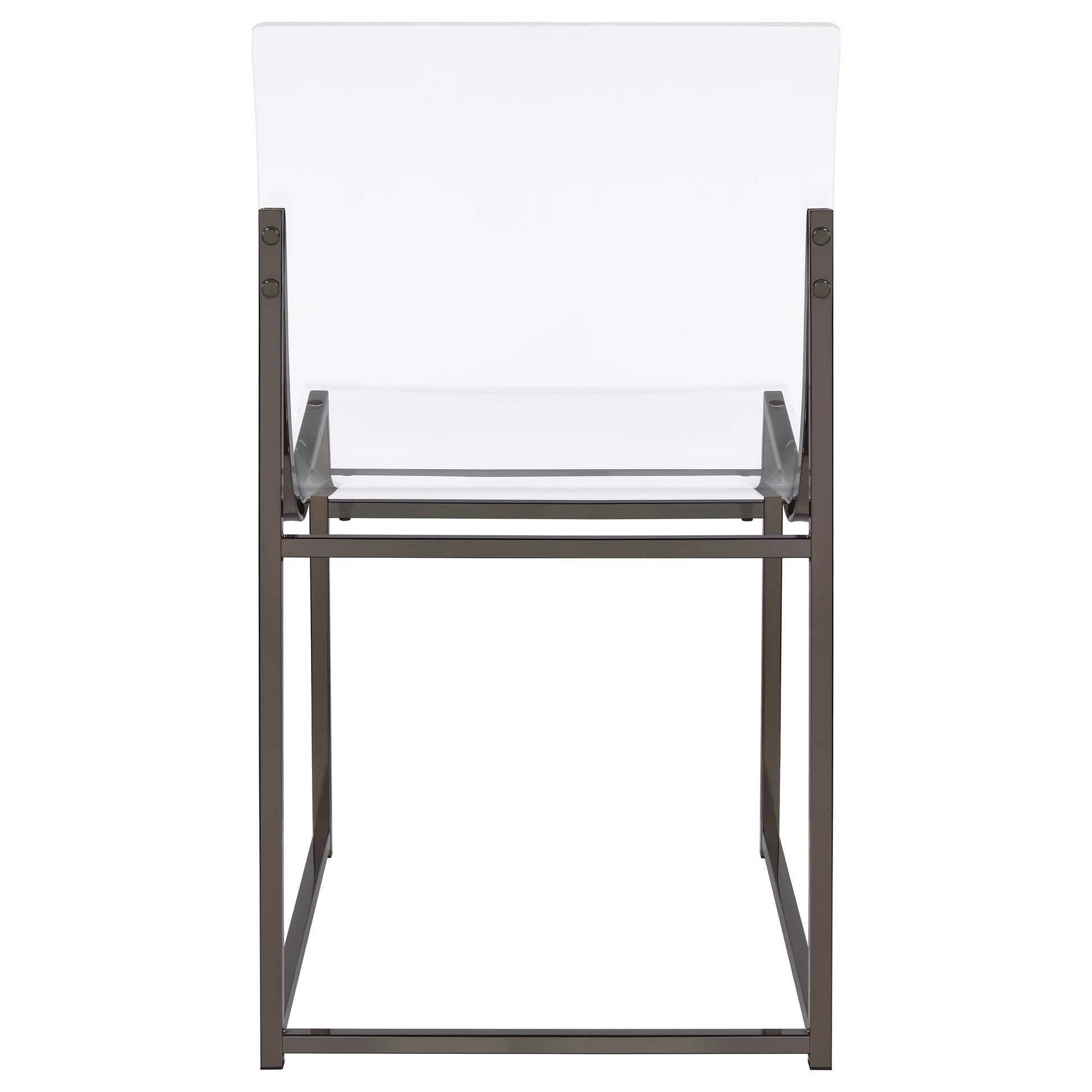 • Dining chairs feature clear acrylic backs and minimalist metal frames