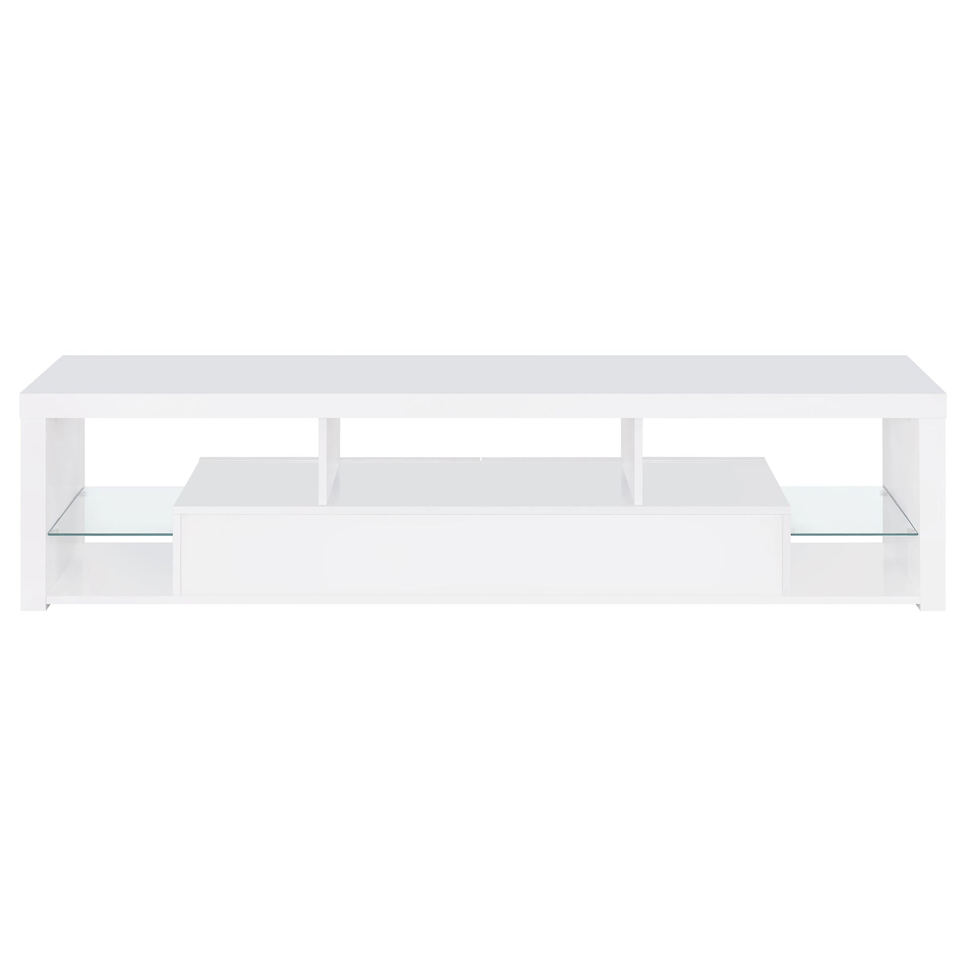 • Sleek, modern TV stand with pristine glossy white finish and clear glass accents