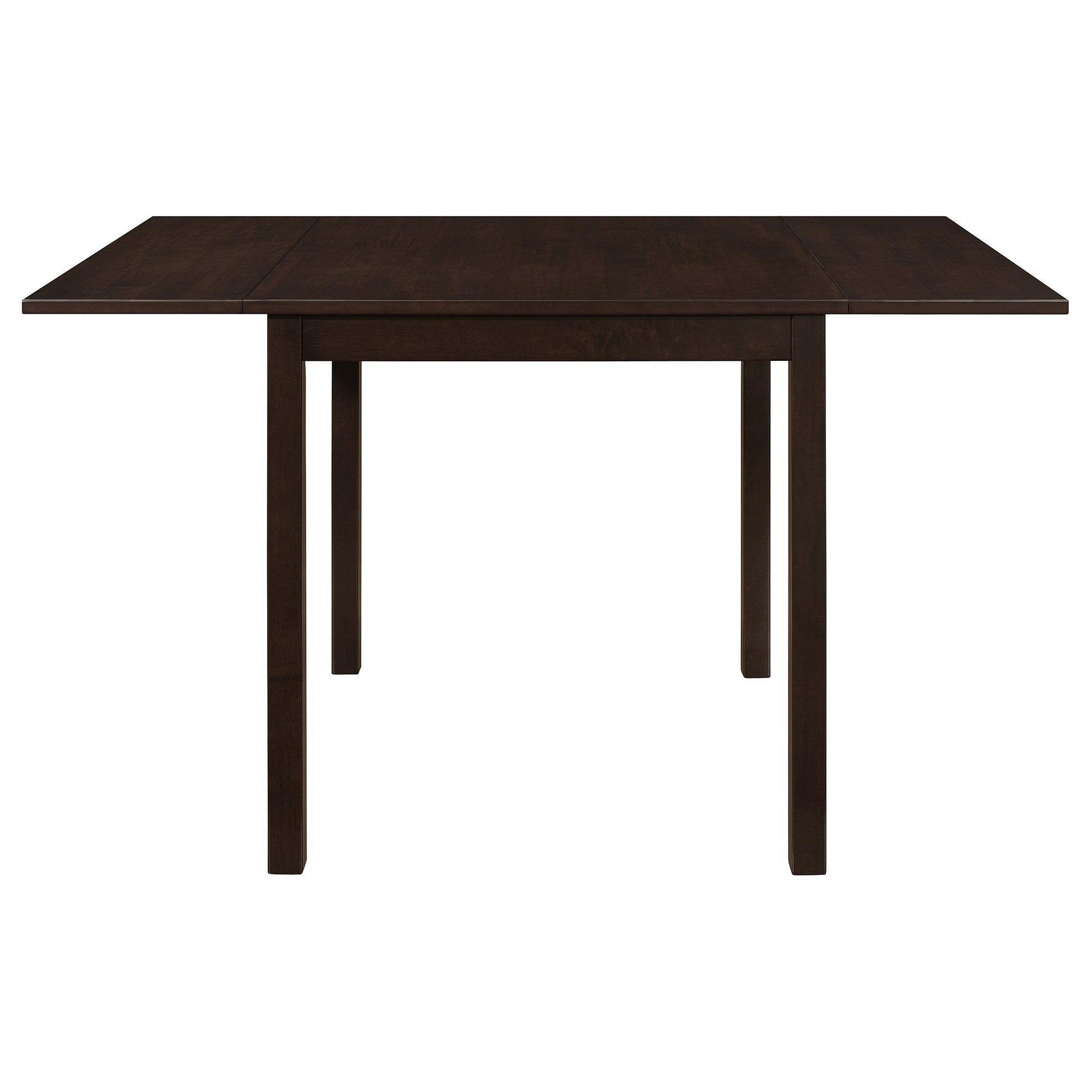 Designed for style and versatility, this drop-leaf dining table makes the most of compact spaces. Its rectangular top easily extends with foldable ends, offering flexibility for everyday meals or hosting guests. The rich cappuccino finish brings depth and warmth, while straight block legs provide clean, contemporary structure. Crafted from solid rubberwood, veneer, and engineered wood, this durable table complements both modern and transitional dining areas with timeless appeal.