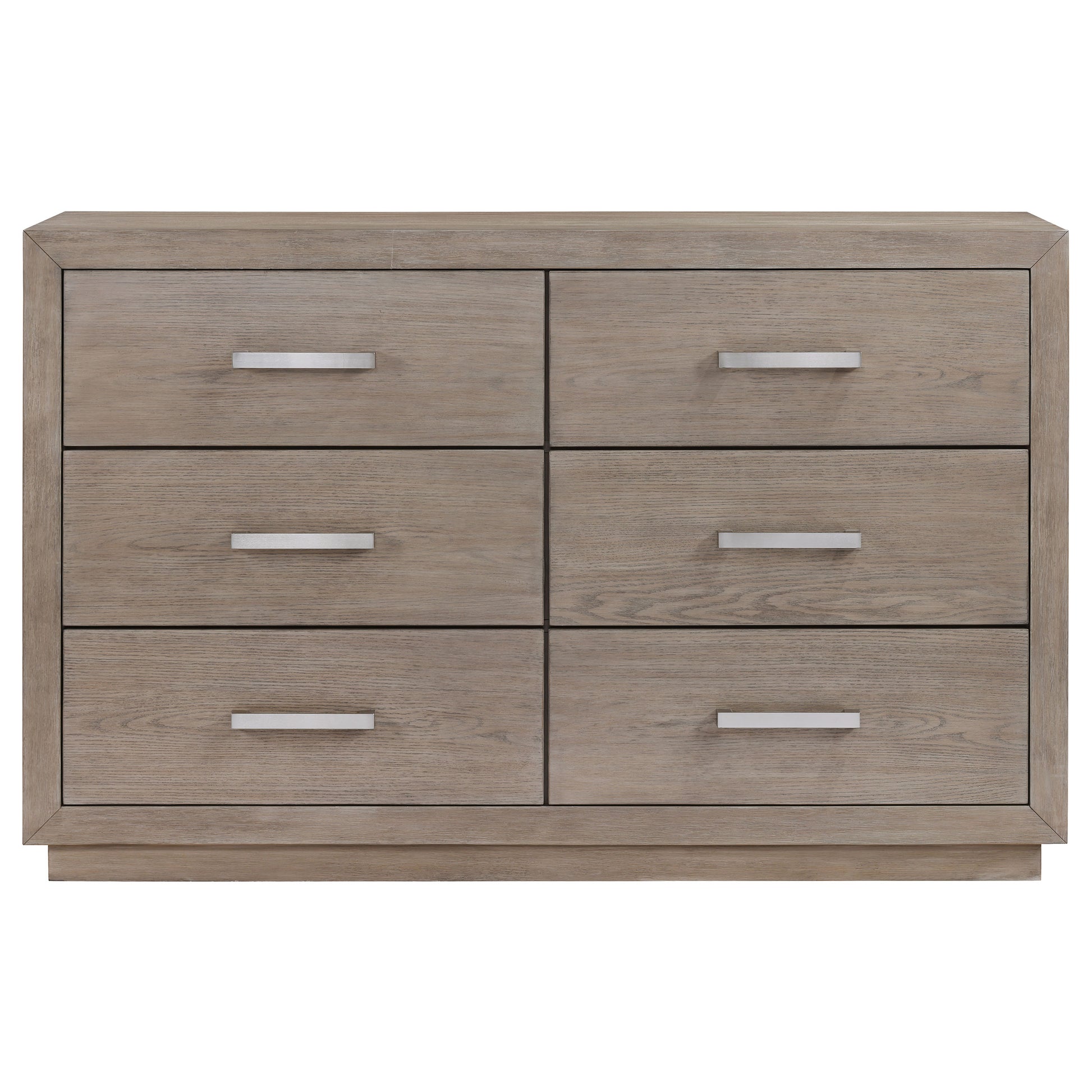 Enjoy the roomy storage and understated character of a modern six-drawer dresser. It's a fresh, understated design that showcases a wide top and recessed base that pair to deliver a timeless look. The dresser shows off wood grain details in a neutral barley brown finish, delivering stylish flair that complements in any setting. Each drawer is equally sized for easy storage and organization. Chrome finish bar pulls add a touch of contrast and textural appeal.
