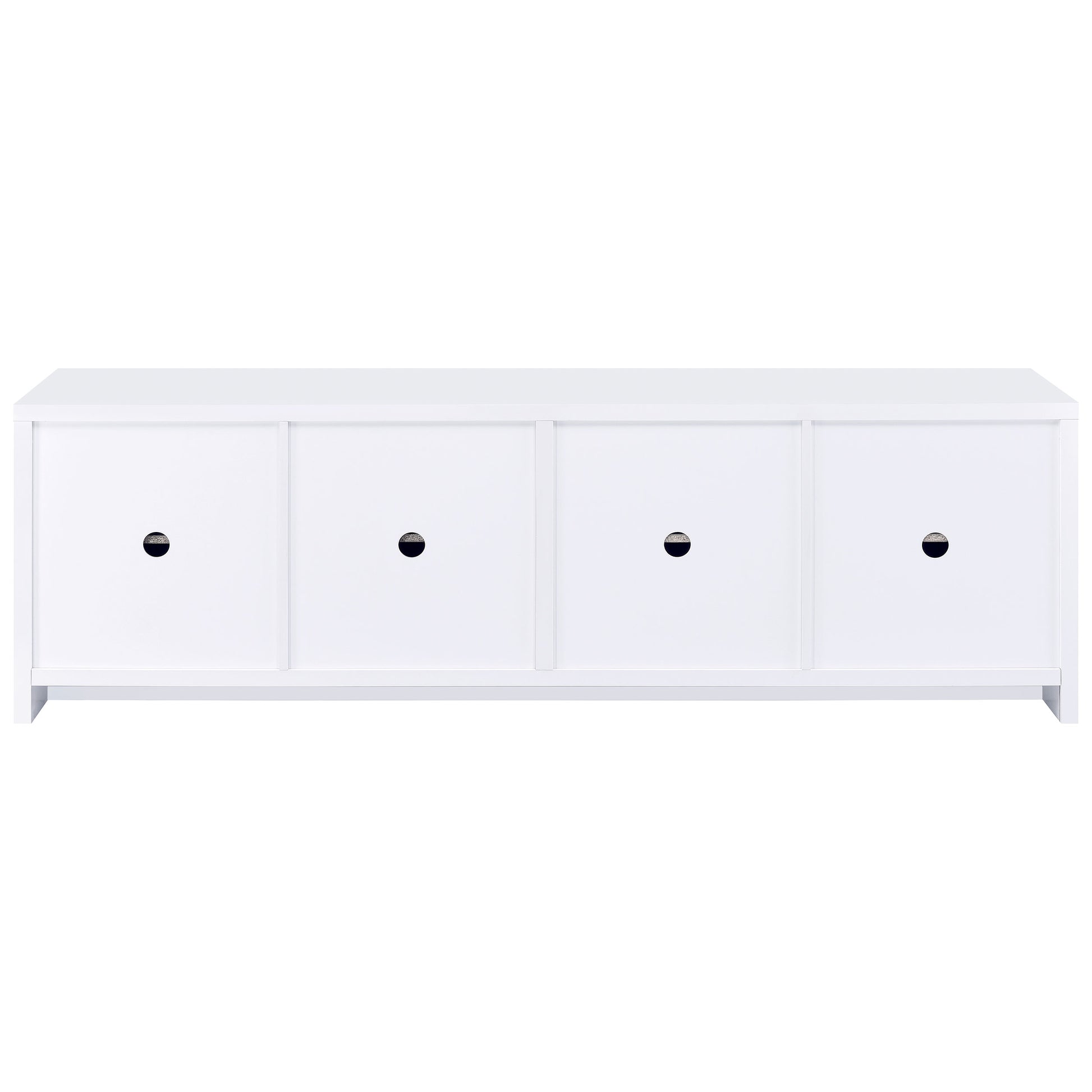 Create plenty of storage to accompany your large screen television with this modern TV stand. Designed to host a TV up to 85 inches, it's a long, linear structure with clean, precise lines that blend into most spaces. Its neutral finish complements melamine surfaces that add durability, perfect for a family living space. Four doors open to reveal interior shelving that's adjustable and includes cord management openings for easy organization of media and gaming components. Use the added shelving for accessories and media in your tidy, organized space.