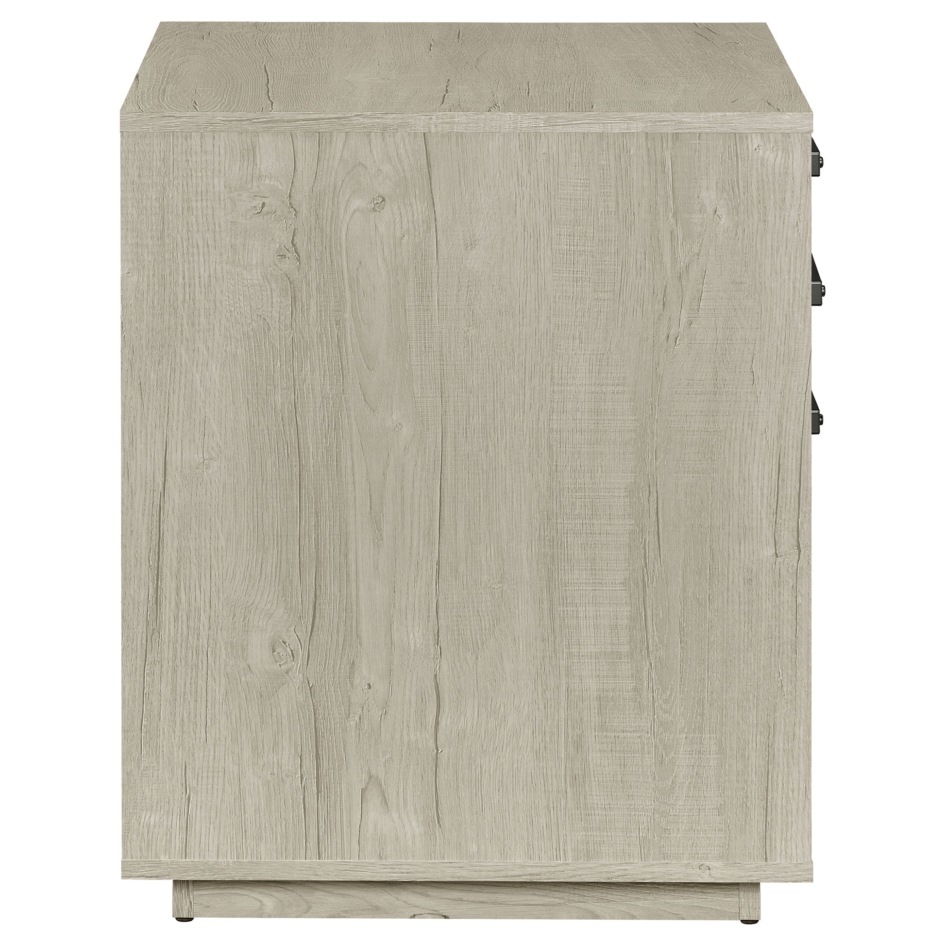 Streamline your workspace with this modern file cabinet, designed to enhance both form and function. The clean, box-style silhouette is finished in a soft whitewashed grey that brightens any office setting. Three spacious drawers provide organized storage for files, stationery, and office essentials. Sleek gunmetal bar pulls add an industrial touch, balancing the light tone with subtle contrast. Built from engineered wood and a durable laminate veneer, it offers strength and everyday practicality.
