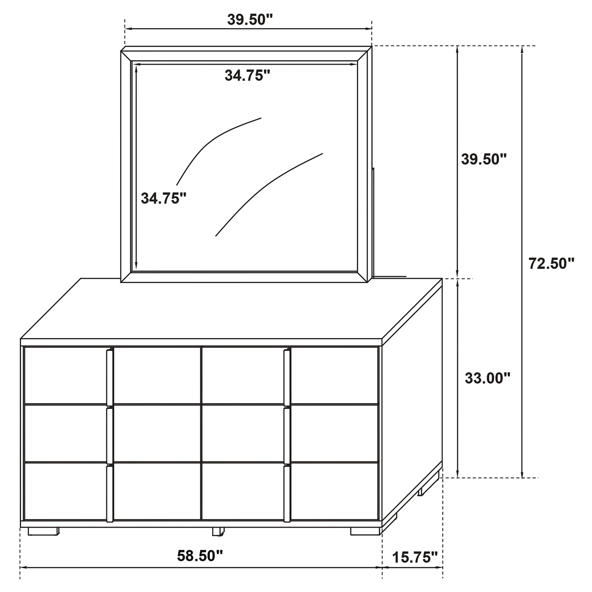 Immerse yourself in the striking elegance of the this dresser and mirror set, a true embodiment of contemporary chic with an Art Deco twist. The six-drawer dresser, crafted with wood products, showcases a captivating vertical design, with gold finish metal accents creating a mesmerizing geometric pattern. The drawers, featuring English dovetail construction, glide smoothly on center metal runners, marrying form with function. Above, the sleek, minimalist mirror, framed in engineered wood and decorative laminate, complements the dresser, its non-beveled glass amplifying the room's space and light. Together, this set offers a harmonious balance of dramatic aesthetic and practical elegance, transforming the bedroom into a modern-day sanctuary.