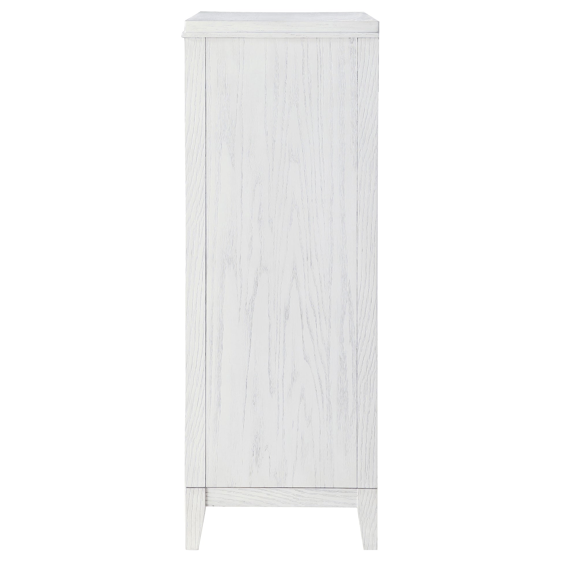 Add easy storage and inviting style to your bedroom with a modern five-drawer chest. It's tall, compact silhouette conserves space while adding welcome storage and organization. The chest features a distressed white finish to highlight wood grain details for a fresh, organic effect in your bedroom. Antique brass-toned bar pulls add contrast and definition on trimmed drawer fronts, creating inviting texture and depth. Tapered legs finish off this inviting look and a tip over restraint is included for added safety.