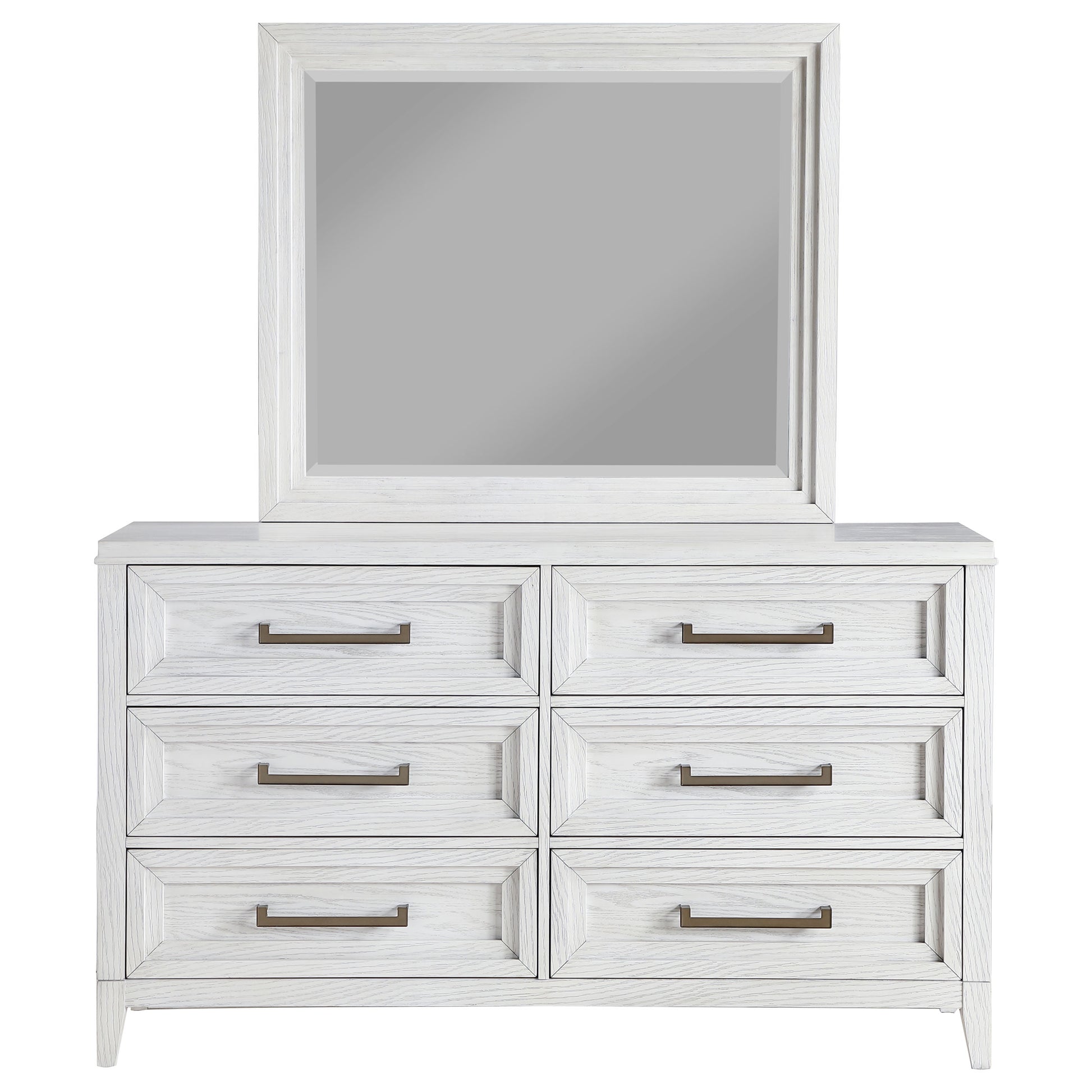 Introduce fresh style and inviting texture with a modern six-drawer dresser and framed mirror. It shows off a distressed white finish over wood grain texture, offering an inviting look and feel in your living room. Each drawer front features layered trim that creates depth and is augmented with a long bar pull in antique brass finish to create contrast. The mirror on top features a squares silhouette with layered trim that matches drawer fronts. Tapered legs complete the look and a tip over restraint is included to add safety in your bedroom.