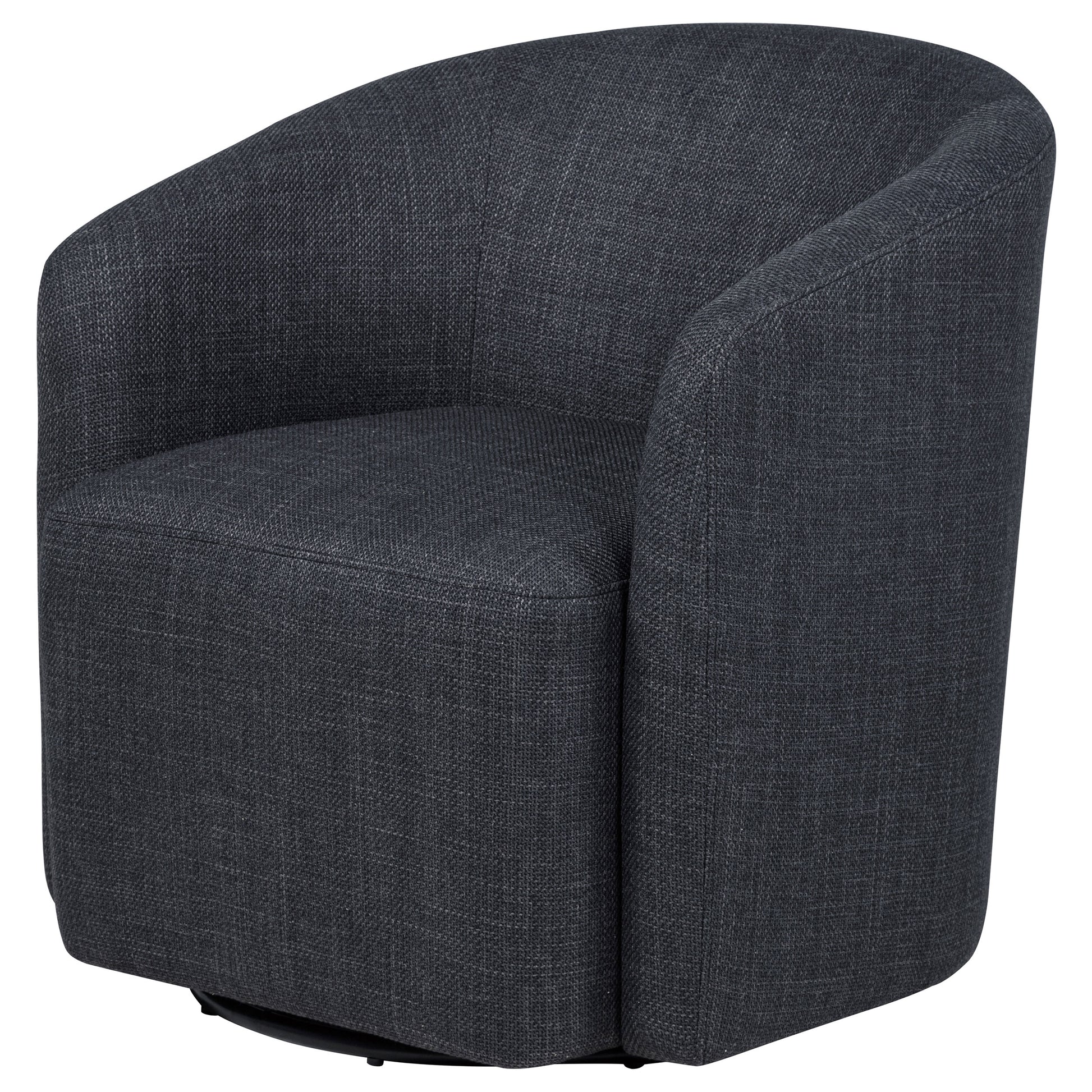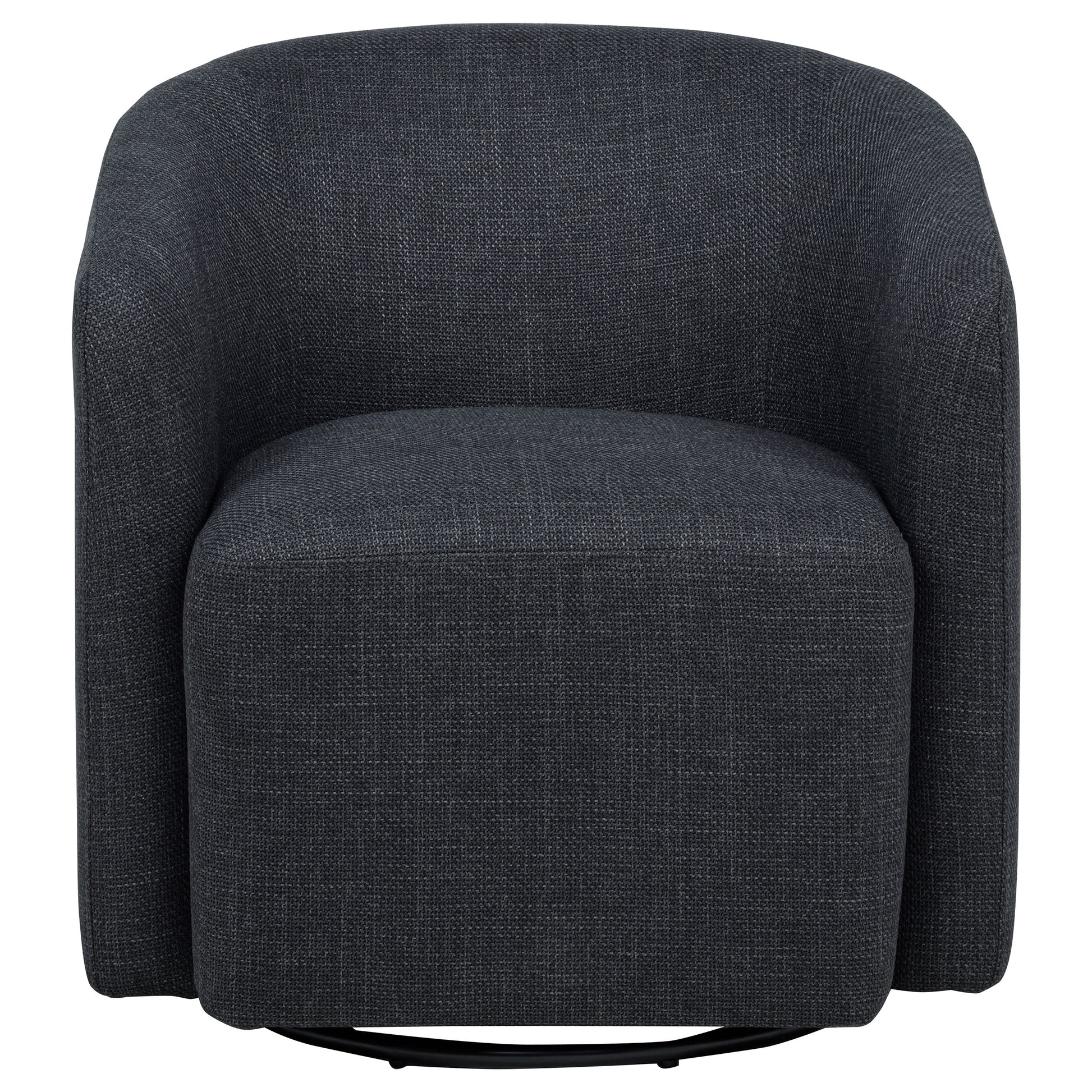 Compact comfort takes a refined turn in this swivel accent chair. Its rounded barrel back and seamless upholstery wrap the frame in sculpted softness, while a hidden swivel base adds dynamic functionality. Tailored for modern lounging, the foam-padded seat delivers support without bulk. With a space-conscious footprint and versatile silhouette, it effortlessly balances form and function in small living spaces or cozy nooks.