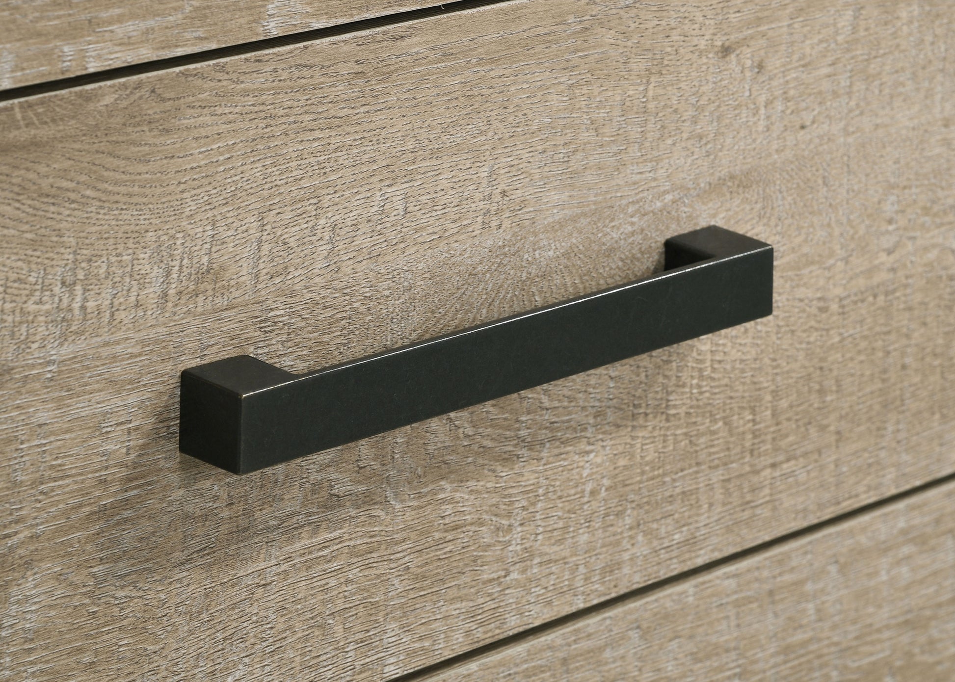 This five-drawer chest combines rustic appeal with practical vertical storage, making it ideal for smaller bedrooms. Finished in weathered oak, it is made from engineered wood with a scratch-resistant veneer for durability. Smooth-gliding drawers with dark bronze handles provide easy access to clothing and essentials, while its compact design maximizes floor space. Blending natural textures with a clean, modern aesthetic, this chest delivers stylish functionality for any rustic or transitional bedroom.