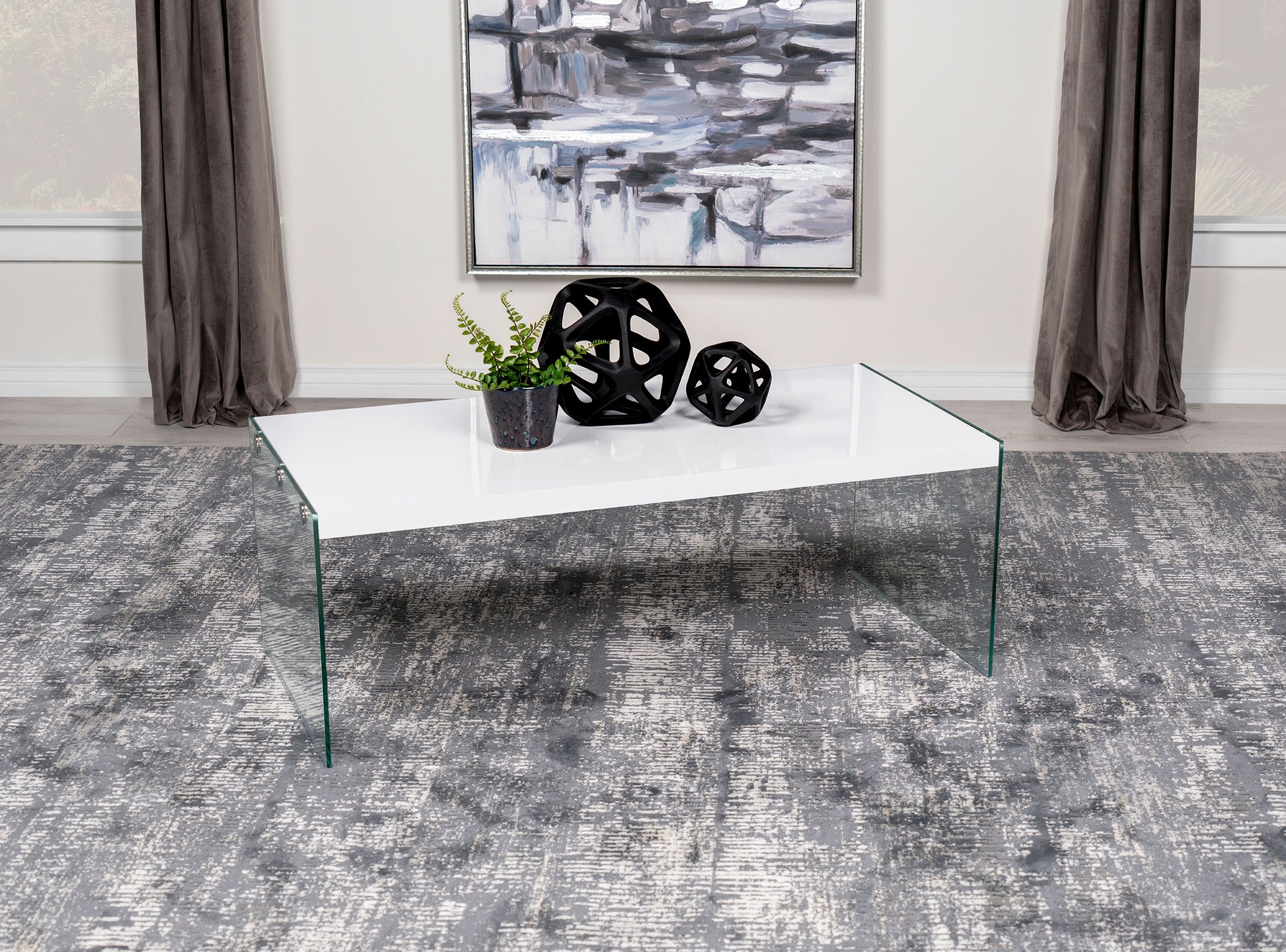 Elevate your living room with this ultra-modern rectangular coffee table, designed to blend sleek aesthetics with functionality. The engineered wood top showcases a white high-gloss finish, delivering a clean, contemporary vibe. Clear tempered glass side panels create a striking floating effect while ensuring stability. Ideal as a cocktail table, this piece is perfect for both everyday use and entertaining. Its minimalist design effortlessly complements modern interiors.