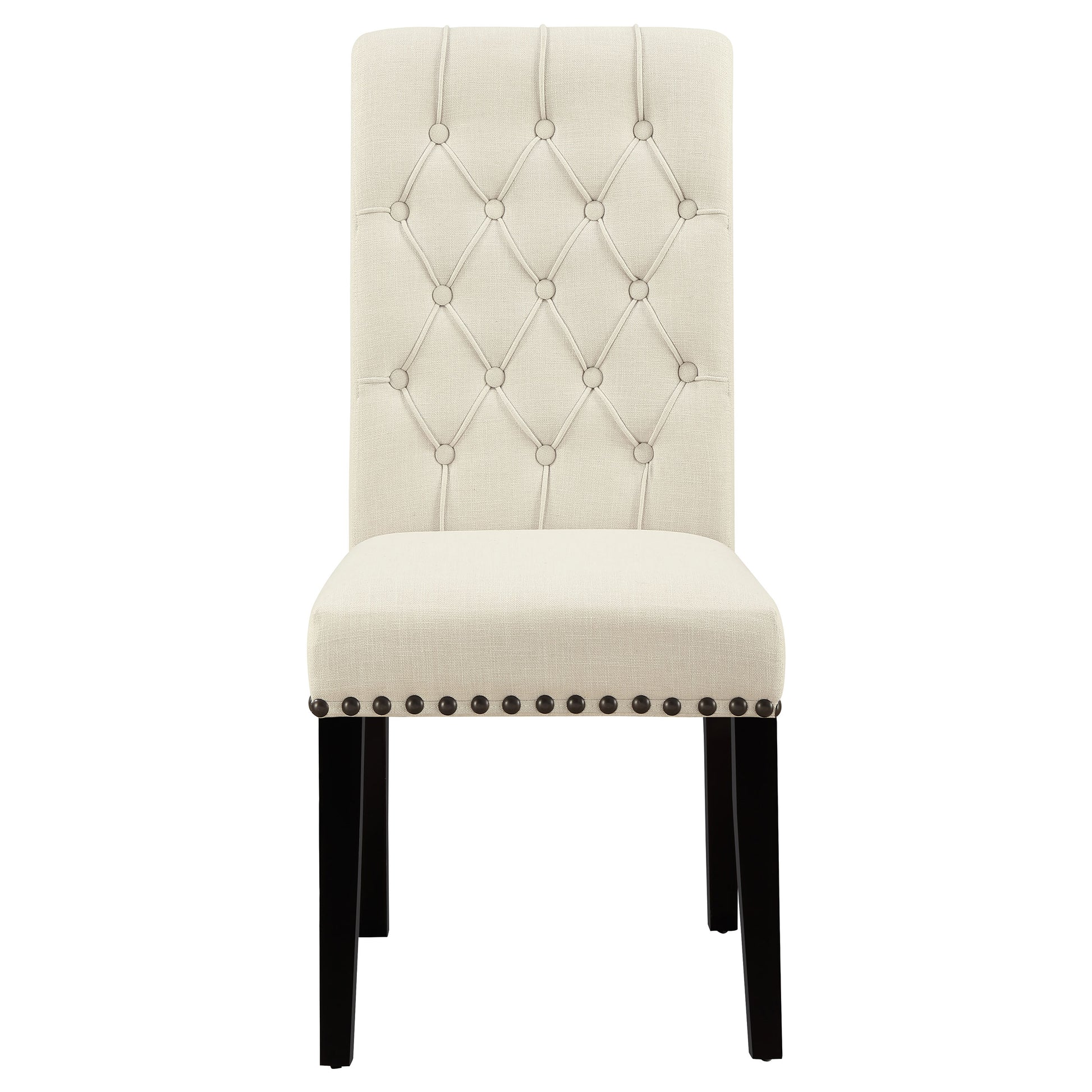 This stunning 5-piece dining room set is sure to be showpiece of the home. The rectangular wood dining table is marvelously crafted with clean, crisp lines. Its two sturdy legs feature a mix of curved lines and sharp angles for a strong, imposing manner. The four side chairs feature plush cushioning and rolled seatbacks with button-tufted craftsmanship. Chairs are upholstered in brilliant white fabric with contrasting nailhead trim and leg finish.