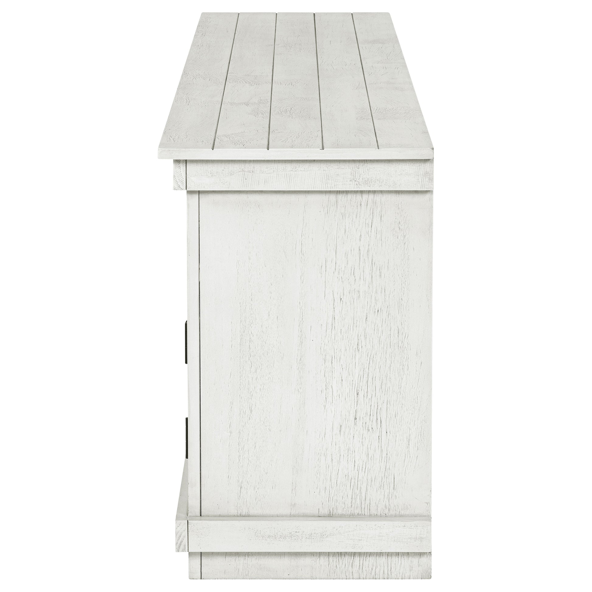 • Roughhewn wood markings add artisan character to a modern farmhouse TV stand