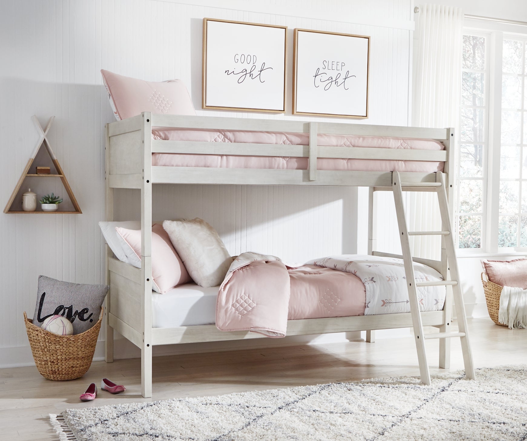 Elegant, timeless furnishings take your bedroom to the next level. Nothing does that better than this twin over twin bunk bed. The antiqued white finish with a wonderful grain texture gives this youthful bed a sophisticated touch. And with its space-saving design, it adds a layer of must-have function to a kid’s bedroom.