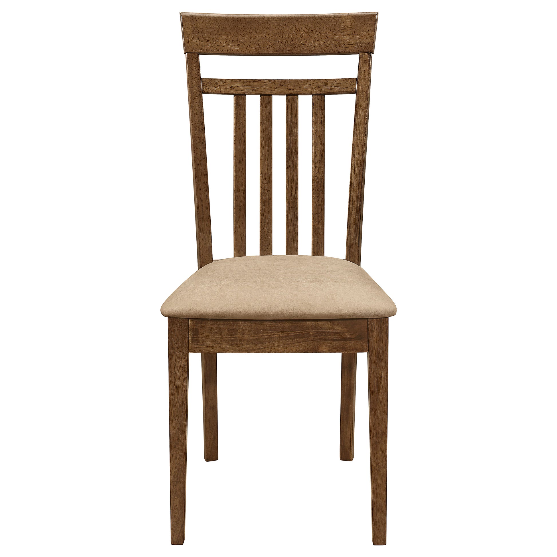 Bring casual sophistication to your dining area with this five-piece dining set. The rectangular table features clean lines and tapered legs, offering a timeless look that complements transitional spaces. Each chair showcases a classic slatted back design for added support and style. Plush cushioned seats upholstered in soft beige microfiber enhance comfort. Crafted from solid rubberwood, engineered wood, and okume veneer, this dining set provides lasting beauty for everyday dining.