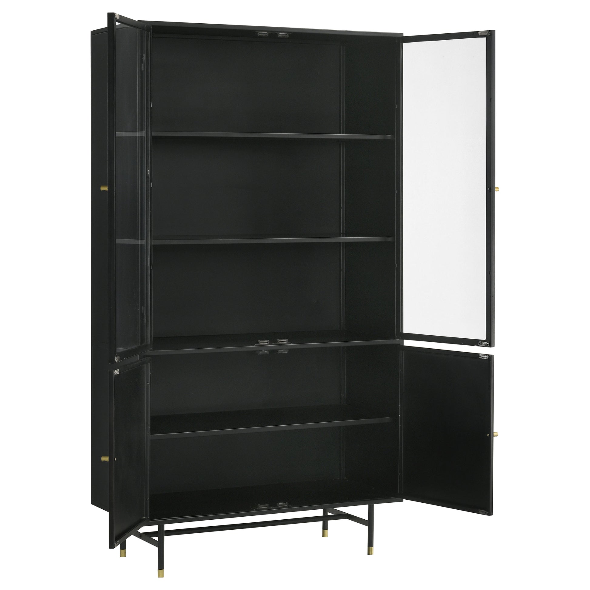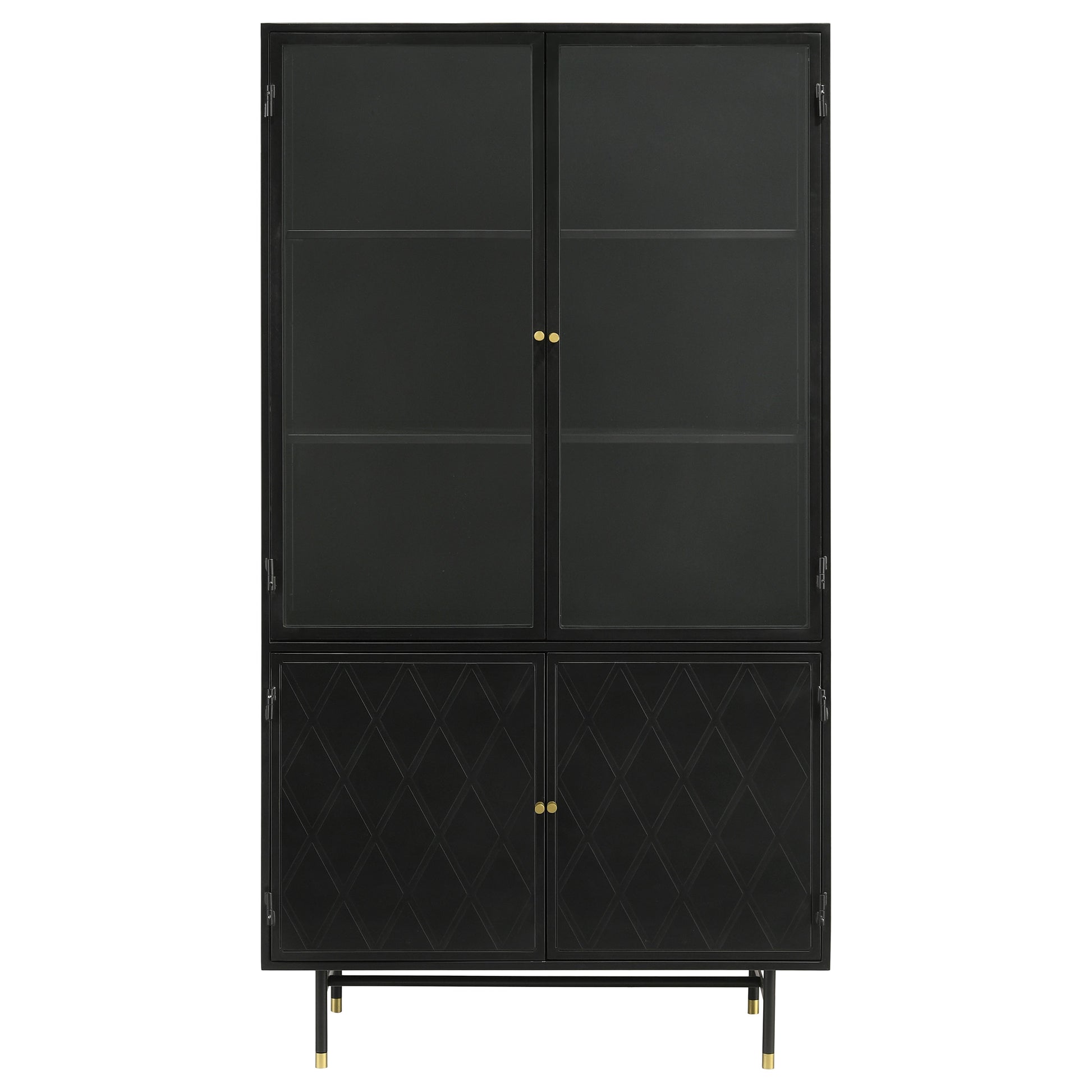 This industrial style metal cabinet offers ample storage space and a bold look in a space. With its matte black finish and accents of antique brass finish hardware, the cabinet offers a subtle contrast while exhibiting style and grace. With its tall design and rectangular shape, this cabinet takes up minimal floor space, bringing the eye up to showcase decor and collections behind tempered glass doors. Adjustable shelves and interior shelves behind the bottom cabinet keep everything from barware to throws and linens. Resting on a trestle base with legs capped in a matching antique brass finish hardware, this elegant and stately accent cabinet offers a touch of glam too.