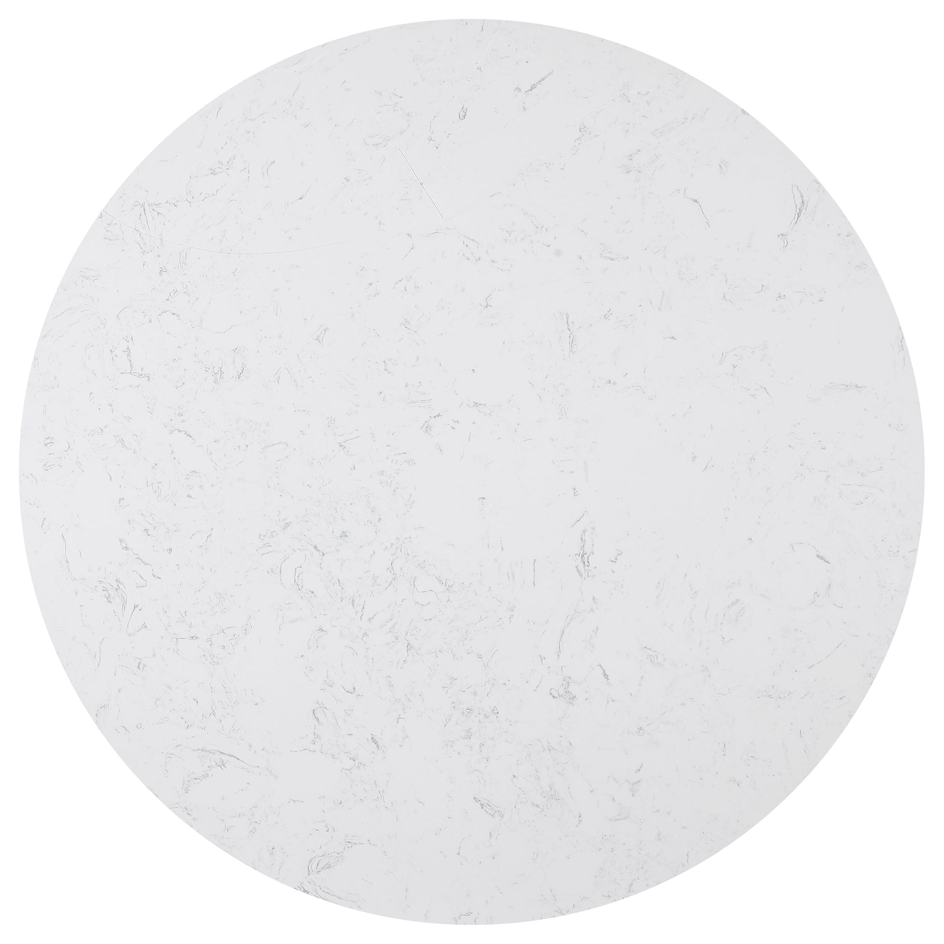 Transform a contemporary dining room with this modern, round dining table, designed with a lustrous, white, cultured marble, table top and a rustic espresso finished pedestal base for a contrasting look. Spacious enough to seat four people comfortably, this beautiful dining table features a 54-inch round table top of thick cultured marble that rests on a grounded, round pedestal base, providing a balanced and sophisticated silhouette to dining room spaces.