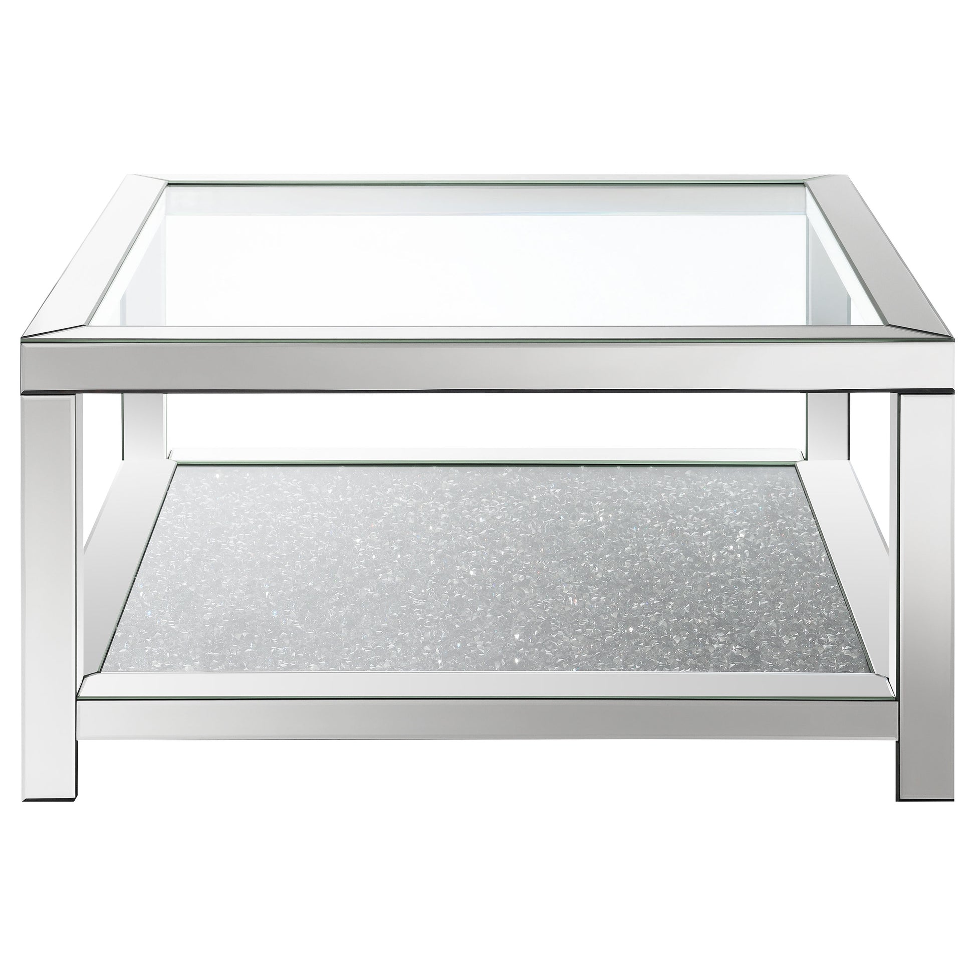 This glam mirrored coffee table is the epitome of Hollywood Regency vibes. Designed with beveled mirror trim and a tempered clear glass top, it offers modern flair and sophistication. The sparkling acrylic jewel-encrusted bottom shelf adds a dazzling touch, while mirror tile accents elevate its chic, refined design. A perfect centerpiece for glamorous living spaces, this table seamlessly blends style and functionality.