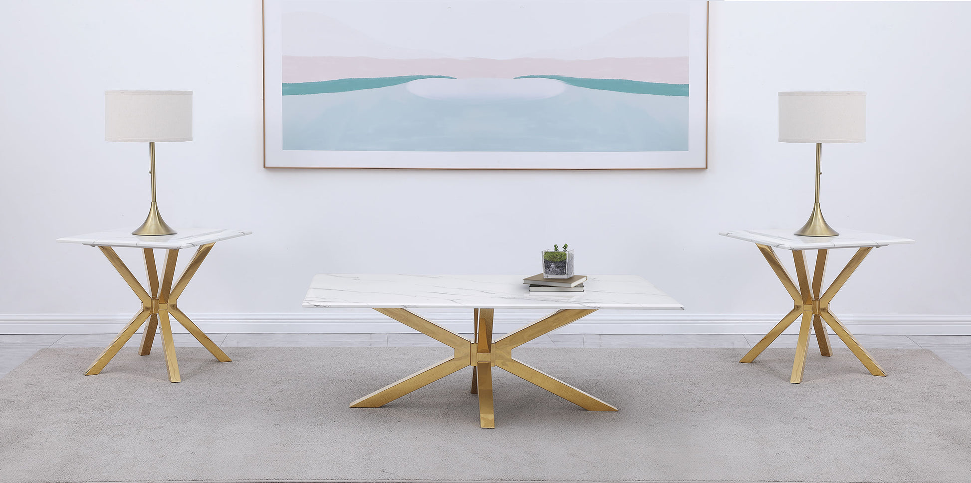 Upgrade your living room with this modern coffee table set, featuring a rectangular coffee table and a square end table. Each piece boasts a white faux marble top with realistic veining for timeless elegance. The star-shaped bases, crafted from durable stainless steel, are coated in a radiant gold finish using Particle Vapor Deposition (PVD), offering a blend of sculptural design and lasting durability. This set is the perfect combination of contemporary style and practical functionality for any modern space.